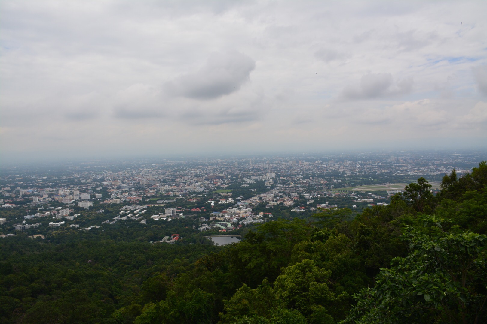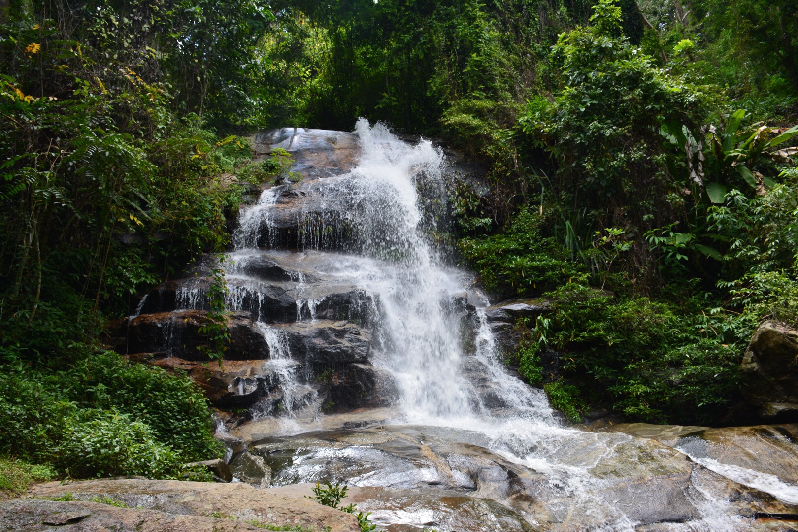 Al snel kwamen we de eerste waterval tegen. Deze waterval was mooi om te zien, maar alleen goed te zien vanaf boven. Ik probeerde nog naar beneden te lopen via de stenen, maar op een gegeven moment was de begroeiing te dicht. Na deze waterval was ons volgende stoppunt een viewing point. Vanaf dit punt had je een prachtig uitzicht over Chiang Mai en het omliggende gebied. Na hier even gekeken te hebben, gingen we verder naar boven. De weg bestond uit vele bochten. De route leek mij een mooi parcours om te rijden met je motor.