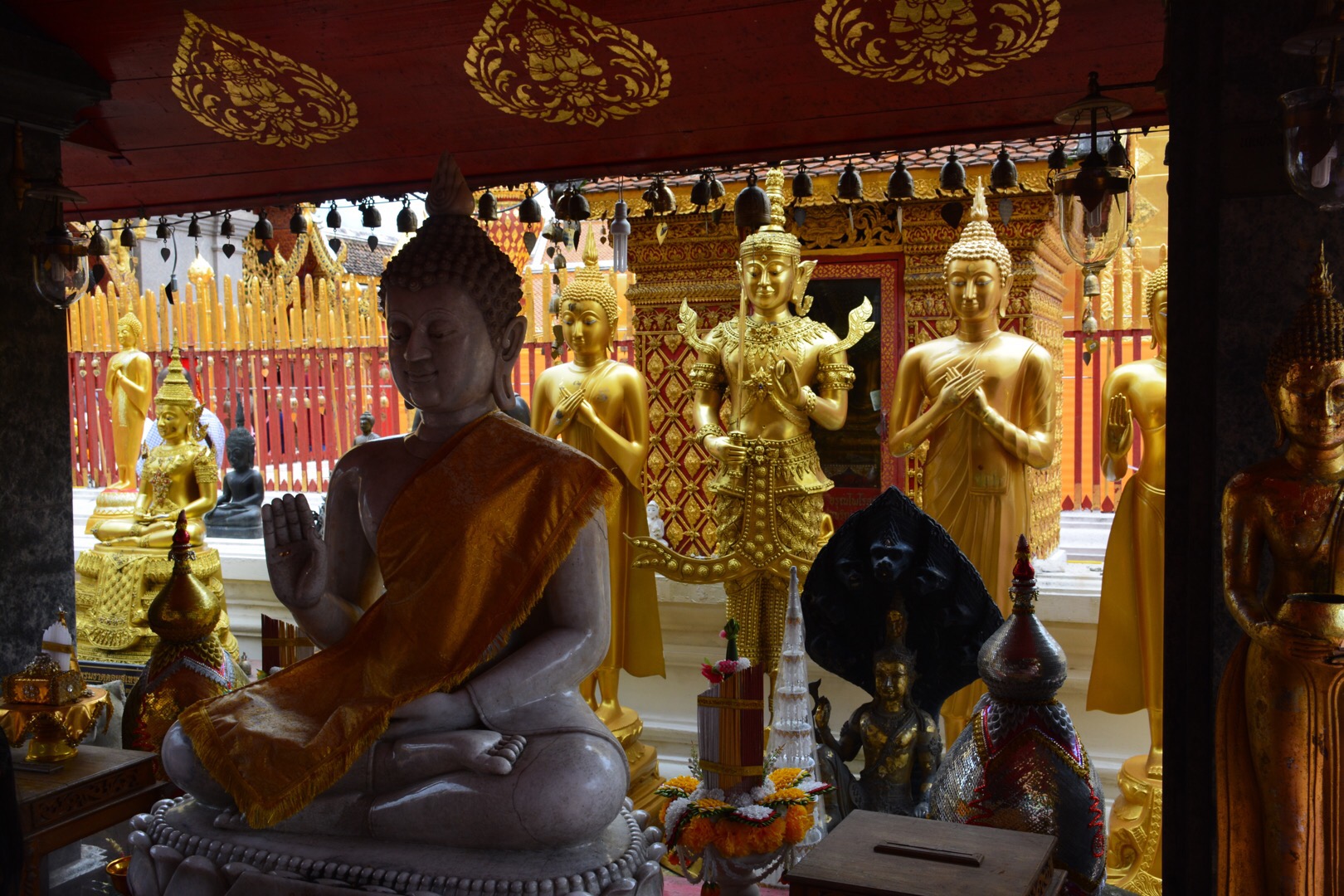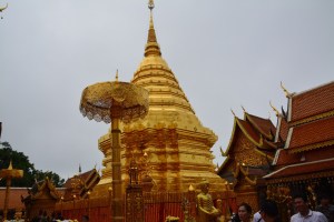 Uiteindelijk kwamen we aan bij Wat Doi Suthep. Deze gouden tempel werd aangeschreven als de meeste indrukwekkende van Chiang Mai. Daar aangekomen, kon ik dit bevestigen. Bijna de gehele tempel had een gouden kleur. In het midden van de tempel stond een chedi (zo’n punt net als de drie in Ayutthaya). In deze punt zouden relikwieën van Boeddha liggen. Als je de chedi wil bezoeken, moest je eest je schoenen uitdoen voor je naar binnen mocht. Om de chedi heen stonden diverse Boeddha beelden, stonden mensen met wierook en waren mensen aan het bidden richting de chedi. Overal waar je keek zag je dingen gebeuren rondom het boeddhisme. Als iemand daar niet bezig was met zijn geloof, dan was het een toerist. Buiten het centrum van de tempel liepen en zaten ook nog monniken. Of zij daadwerkelijk in de tempel leven weet ik niet. Daarnaast kon je ook vanuit de tempel een prachtig uitzicht krijgen van de stad en omgeving.