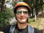 Al snel scheurden Nick en ik tussen het verkeer door als de andere scooters. Ik zie nu ook beter waarom het lijkt alsof alles maar overal tussendoor gaat. Er is vaak veel ruimte tussen auto’s om met je kleine scooter van rijbaan te verwisselen. Daarnaast staat vaak een hele rij auto’s bij verkeerslichten stil, waardoor je met je scooter makkelijk tussen de auto’s door naar voren kan. Daarnaast trekken de scooters snel op. Je bent dus zo op snelheid. Scooters rijden in Thailand rond de 40/50 km/u als je het rustig aan doet. Een aantal mensen rijdt nog een stuk harder. Gelukkig had ik een prachtige helm (zie foto) op. Het was heerlijk om een stuk te rijden door de stad en vervolgens de berg op.