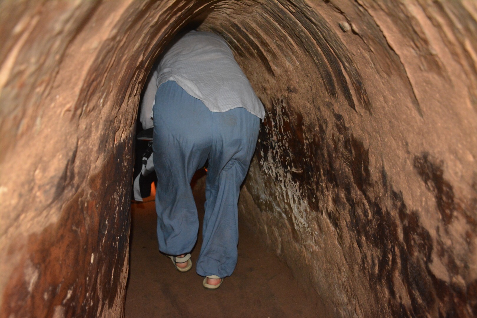 Daarnaast kregen we uiteraard de tunnels zelf te zien. Dit begon bij het gat waar de Vietcong doorheen moesten. Dit gat was 40 bij 60 cm. Hier konden de toeristen als ze wilden inkruipen om te voelen hoe het was. Ik had verwacht dat ik bij lange na er niet in zou passen. Er was echter een man voor bij, die nog wat dikker was dan ik, die er ook in paste. Helaas hadden we niet genoeg tijd. We waren namelijk met een best wel grote tourgroep. Dit betekent dat we niet te lang konden wachten en vaak snel door moesten. Wat iedereen wel kon doen was de tunnel in. Deze tunnel van 150m lang, 1,20 m hoog en 60 cm breed was niet makkelijk om doorheen te kopen. Ik kon er gehurkt of kruipend net doorheen. Ze hebben dan notabene de tunnel al breder gemaakt, zodat westerse toeristen er doorheen kunnen. Wanneer je de tunnel ingaat kom je om de 20 m een uitgang tegen. Dit zorgt ervoor dat je niet te snel verdwaalt. Daarnaast wordt de tunnel steeds smaller/kleiner naarmate je dieper gaat. Het is dus geen aanrader als je last hebt van claustrofobie. Als ik er vervolgens bij nadenk dat de Vietcong dus dagelijks door deze smalle tunnels kropen…