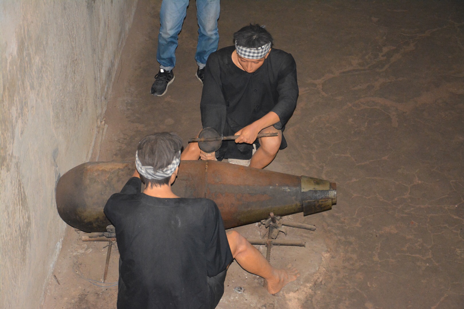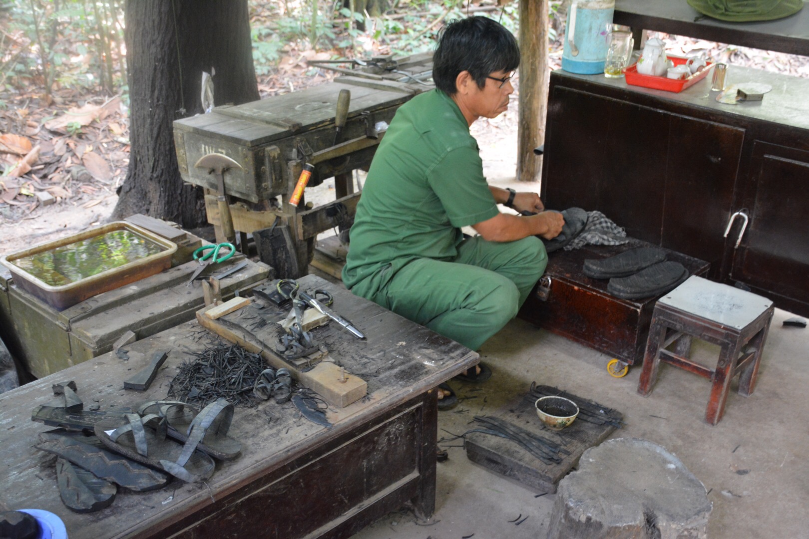 Daarnaast had je ook nog verschillende werkruimtes in de tunnels. Hierin maakten de Vietcong bijvoorbeeld kogels. Dit deden ze niet zelf. Ze gebruikten bommen van de Amerikanen die niet zijn afgegaan. Ze ontmantelden de bommen en haalden het kruit eruit. Hiermee konden ze nieuwe wapens maken. Overige wapens bestonden uit primitieve wapens gemaakt van bamboe en staal. Een andere werkplaats die ze hadden was om sandalen te maken. Deze maakten ze van oude banden. Bij een hutje waar wij kwamen, werden ze dan ook voor toeristen nog steeds gemaakt. Het voordeel van deze sandalen is dat er geen lijm werd gebruikt en ze dus ook in het water gedragen konden worden. Daarnaast hadden de Vietcong iets slims bedacht. Als ze wisten dat er Amerikanen in de buurt waren, draaiden ze hun slippers om. Hierdoor leek het alsof ze de andere kant opliepen.