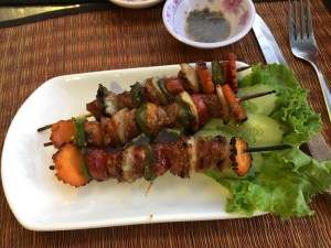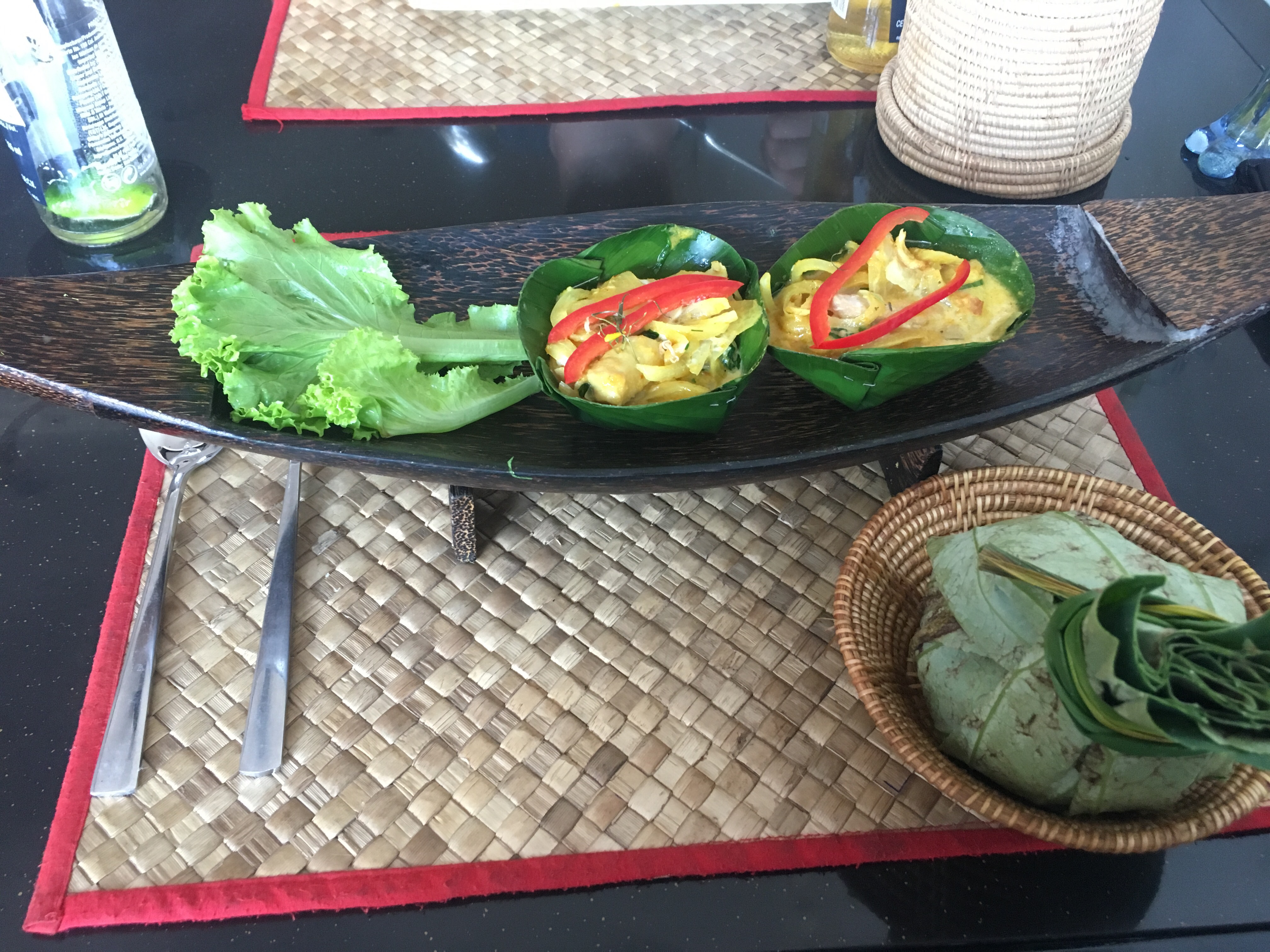 Eenmaal terug gekomen, heb ik gekeken hoe het met Nick ging. Hij wilde wel wat gaan eten. Wij zijn dus bij een restaurant in de buurt gaan eten. Hier had ik een gerecht genaamd Amok. Dit is een curry met vis gestoomd in ene bananenblad. Het gerecht smaakte goed en werd ook nog een leuk opgediend. Het eten was in het restaurant niet duur en de bediening erg vriendelijk. Zeker een restaurant om nog een keer terug te komen. Na het eten hebben we niet veel bijzonders gedaan. In de avond zijn we gaan eten bij een Combodiaans grill restaurant. Deze stond goed aangeschreven op tripadvisor; vooral de spiesjes zouden erg goed zijn. De spiesjes waren inderdaad lekker, maar niks bijzonders. Het was niet veel beter dan de sjasliek die je koopt bij de Lidl voor de BBQ. Wel lekker gegeten dus, maar niks bijzonders.