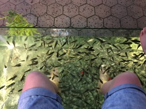 In de avond zijn we nog naar de Nachtmarkt van Siem Reap geweest. De markt zag er leuk verlicht uit en leek ons de moeite waard om te gaan kijken. Al met al was het geen heel bijzondere markt, althans niet veel anders dan de meesten; hij sprong er niet uit. Toch nog een leuke souvenier gekocht. De vrouw vroeg er $7 voor en ik nam hem mee voor $2. Was een erg moeilijke onderhandeling. Of nee, toch niet… Op de markt kwamen we ook een van de velen massages tegen. Deze keer eentje met vissen. Je kent ze waarschijnlijk wel. Een aquarium vol met vissen die aan je voeten eten (denk ik?). Het waren echter wel iets grotere vissen dan je ze normaal ziet. In het begin was het even wennen, maar uiteindelijk voelde het heerlijk aan. Gewoon rustig zitten en de vissen van je voeten laten eten.