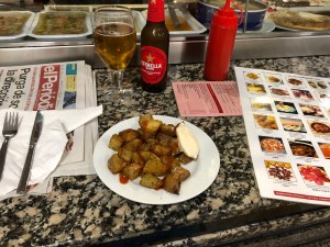 De volgende bestemming moest ik ongeveer een 1,5 uur voor vliegen. Op naar Barcelona! Hier aangekomen meteen mijn hostel opgezocht. Na ene vriendelijk ontvangst mijn spullen daar gedropt en de stad in gegaan. Althans, de stad in gegaan, iets te eten gezocht. Ik kreeg een tapas restaurant in de buurt van het hostel aangeraden waar ik naartoe gegaan ben. Dit was een duur restaurant voor tapas. Dit ik heb ik dus gelaten voor wat het was. Heb het maar gehouden bij kip met patates bravas. De patates had ik erbij genomen omdat er bij de kip geen friet zou zitten; wel dus… Ik heb echter totaal geen spijt van de genomen patates. Geserveerd met traditionele bravas saus en daarbij crème fraiche, waren dit heerlijke stukjes aardappel. Na een week lang voornamelijk pasta en pizza waren een paar aardappels sowieso wel lekker; ik blijf toch een Hollander hè 😜.
