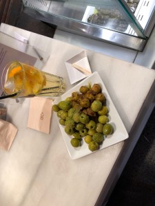 Van al het lopen krijg ik wel honger, dus ging ik opzoek naar iets te eten. In de buurt was een churros restaurant dat erg goed scoort. Heb hier dus churros con chocolate (churros met chocolade) besteld. Deze smaakten goed, maar niet veel anders dan churros die ik vaker heb gehad; dit had ik ook met de churros in Barcelona. Je kunt ook niet heel veel verpesten aan churros natuurlijk. Misschien dat er daarom weinig verschil is in smaak. Vanuit de churros bar doorgelopen naar Plaza Mayor. Wederom een groot plein met veel restaurantjes er omheen. Heerlijk om even te zitten niks te doen. Aangezien ik dit net al gedaan heb, ben ik weer doorgelopen. Zo kom je uit op Mercado de San Miguel. Dit is een kleine overdekte “markt” waar ze allemaal tapas verkopen. Markt heb ik tussen aanhalingstekens gezet, omdat het naar mijn idee niet echt een markt is. Naar mijn idee waren het meer kleine open restaurantjes. Het was echter wel leuk om doorheen te lopen en natuurlijk iets te eten. Ik ben gestopt bij een olijven kraam waar ik een bord vol olijven bestelde. Ik liet de verkoper drie soorten uitkiezen. Dit werden met pit, met koriander en een pittige. Dit gezamenlijk met een Sangria Blanco (witte Sangria), zorgden voor een goede lunch.