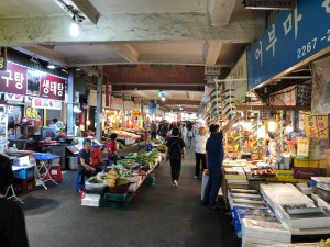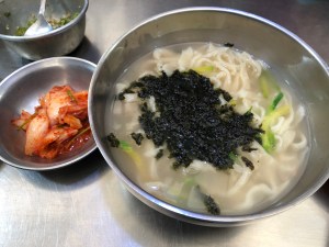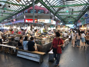 Vanuit Bukchon zijn we doorgelopen naar Gwangjong market. Dit is the place to be voor streetfood in Seoul. Misschien heb je de serie streetfood op Netflix gezien. De aflevering Seoul is ook op deze markt opgenomen. Het vrouwtje waar de hele aflevering om draait was dan ook onze eerste stop. Op de hele markt worden veel dezelfde gerechten gereserveerd. Hier deed deze vrouw eerst ook aan mee (toen ze net begon). Ze besloot uiteindelijk over te gaan op het maken van noodles. Ze snijdt deze met de hand. Bij de soep werd kimchi geserveerd. Naast de soep bestelden we ook een portie dumplings. De meeste lezers zullen dit kennen als gyoza van het sushi restaurant. Dumplings komen in veel verschillende landen voor. Gyoza is de variant uit Japan. De dumplings die wij hadden waren met vlees en kimchi. Beiden smaakten erg goed. Ze eten hier ook met andere stokjes. Tot nu toe waren dit volledig metalen ronde stokjes. Vaak zijn ze van hout of plastic met hoeken eraan. Voor Stephan was het nogal moeilijk om goed te eten. Toen ik al klaar was, leek hij nog te moeten beginnen. De medewerkers van het kraampje zagen dit ook en boden (uit medelijden waarschijnlijk) een vork aan. Na de lekkere maaltijden zijn we opzoek gegaan naar andere kramen die in de Netflix serie kwamen. Helaas vonden we deze niet; toch nog maar een keer op onderzoek uitgaan.