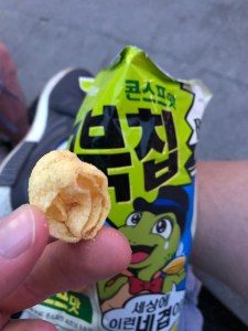 De blog sluit ik af met een lekkere snack die we op het einde gehaald hadden. Een veel gegeten snack is de zakken chips met een schildpad erop. Hier zijn veel verschillende smaken van die je natuurlijk allemaal wilt proberen. Aangezien alle tekst in het Koreaans staat, hebben we er maar een gepakt. We vonden het nog het meest in de buurt komen van een soort popcorn. Niet echt heel zoet, maar met een lichte zoete tint eraan. Op het metrostation was het weer even zoeken naar de juiste lijn. Voor ik het wist stond er weer een Koreaan bij mij om zijn hulp aan te bieden. Ideaal zoiets!