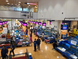 De weg uitlopende keek ik nogmaals op de kaart. Toen viel mij op dat de markt uit twee gebouwen bestond. Een gedeelte waar we net waren en een gedeelte waar de weg naartoe liep. Bij het andere gebouw aangekomen hing er ene fijne sfeer. Een blije vis op de voorkant en borden met welkom bij Noryanjin Fishmarket. Toen we binnen kwamen, leek dit meer op de filmpjes die ik had gezien. Overal stonden bakken met verschillende soorten vis en schaaldieren erin. Het idee achter deze markt is dat je iets koopt bij de kraampjes. Daarna loop je naar boven en kun je je vis laten bereiden. Nu ben ik geen groot visliefhebber en had Stephan nog geen honger, dus dit sloegen we over. Vooral toen we een aanbod kregen om levende octopus te eten. Deze wordt dan in stukjes gehad en terwijl de tentakels nog krioelen, eet je het op.
