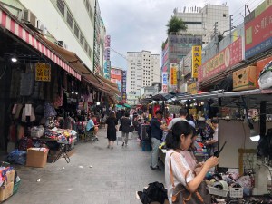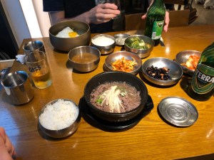 Als afsluiter wilden we wat gaan eten op Namdaemun Market. Het nadeel hieraan was, dat het eten tegenviel. Wel hebben we hier gimbap (Koreaanse sushi variant) gegeten. Dit smaakte verder prima. Ook zag ik hier nog shirtjes van Hard Rock Seoul liggen. Aangezien er geen cafe in Seoul is, wilde ik deze misschien nog meenemen. Voor nu toch nog maar laten liggen. Vanuit de markt zijn we doorgelopen naar een restaurantje 1km verder. Hier heb ik Bulgogi meat gegeten. Volgooi betekent letterlijk vuurvlees. Je krijgt het geserveerd in een stenen kom. Het was wel lekker, maar niet bijzonder. Naar mijn idee was het gewoon aangemaakt gehakt met wat noodles erin. De bulgogi verschilt dan ook wel per restaurant. De dag sloten we weer af langs de rivier om, na een dag met wederom veel lopen, de voeten even te laten afkoelen. Morgen gaat de reis verder naar een nieuwe stad, namelijk Chuncheon.