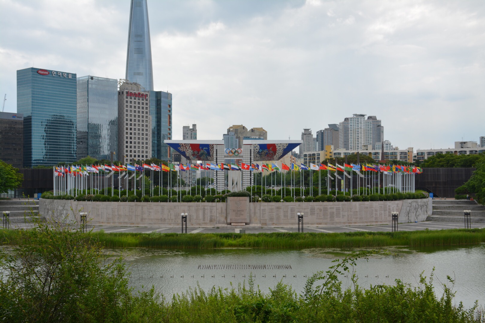 Vanuit de vismarkt gingen we naar onze tweede bestemming. Het Olympisch Park van de spelen in Seoul (1988). Ik was nog nooit in een vergelijkbaar park geweest, dus nu we er toch zijn. Ik had wel een grootte gezien op de kaart, maar had nog geen besef hoe groot het eigenlijk was, tot we daadwerkelijk over het park liepen. Helaas waren bijna alle stadia afgesloten en kon je binnen geen kijkje nemen. Toch voelde je een sfeer hangen op het park. Als je erbij nagaat dat hier duizenden mensen naar de stadions lopen; de sporters die onderweg zijn naar hun wedstrijd; de organisatie die hier omheen hangt. Dit lijkt mij zeker een ervaring die ik nog eens wil meemaken. Wie weer volgend jaar met de spelen in Tokyo. Na een stuk over het park gelopen te hebben kwamen we uit bij een andere ingang. Ze noemen deze ingang the World Peace Gate. Onder de poort brand een eeuwig vuur. De poort symboliseert het samenkomen van landen met verschillende ideologieën die allen meedoen aan dit sport evenement. Dit was dan ook een van de eerste evenementen waaraan de Sovjet-Unie (Rusland), de VS en China het tegen elkaar opnamen. Ook interessant om te zien waren de twee vlaggen van Duitsland. Toentertijd natuurlijk nog de Bondsrepubliek (west) en DDR (oost). Het park is zeker een bezoekje waard.