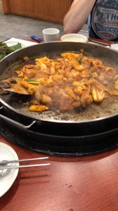 Na een kop cappuccino (moest de 2000W toch nog besteden), gingen we opzoek naar iets te eten. In het centrum was een dakgalbi straat te vinden. Deze straat is gewijd aan typisch Chuncheon eten, namelijk dakgalbi. Dak betekent kip en galbi rib. Je eet echter niet echt kippenribben. De naam snap ik dan ook niet zo goed… Het eten wordt op een wok voor je bereid. De wok is in de tafel gebouwd. Het gerecht bestaat uit (boneless in ons geval) kip, tteok (rijst cake), aardappel en kool. Dit alles gewokt in een saus gabaseerd op gogujang. Dit laatste is een pittige Koreaanse saus. De pittigheid in het gerecht was echter best mild en dus goed te doen. Wanneer alles gaar gewokt is, mag je toetasten en kun je heerlijk eten. Het is echter wel belangrijk dat je tijdens het bereiden van het eten afblijft. Tussendoor lopen koks langs om door het gerecht te roerbakken. Toen een kok wat langer wegbleef, besloot ik zelf maar de spatel te pakken en alles even om te scheppen. Is nog leuk ook toch? Toen een kok het zag, snelde hij naar onze tafel en begon meteen te roerbakken. Al met al heerlijk gegeten hier.