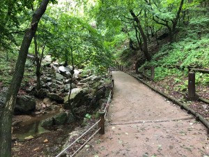 De dag begon vandaag met een busrit van ongeveer 1 uur naar de Gugok waterval. Deze 50 meter hoge waterval, met 9 keringen van het water voor het de grond raakt, is een van de bezienswaardigheden in het Banghwasan gebergte. Na een korte klim (lees makkelijk stuk wandelend) van zo’n 15 minuten bereik je de waterval. In Thailand en Laos heb ik ook een aantal watervallen gezien. Toch moet ik zeggen dat deze toch weer heel anders was. Ik heb zelden zo’n bijzondere waterval gezien. Dan bedoel ik vooral bijzonder als in, hoe kunnen ze dit een waterval noemen… bijzonder. Ongetwijfeld ziet de waterval er normaal prachtig uit, maar nu stroomde er een miezerig straaltje water naar beneden. Een beetje zoals een douche op een gemiddelde vakantie bestemming; het was het net niet. Het zal te verklaren zijn door te weinig regenval o.i.d.. Hier had ik nu in ieder geval geen last van. De weergoden zijn mij wel eens beter gezind geweest. Maar we houden de positiviteit erin en gaan gewoon verder.