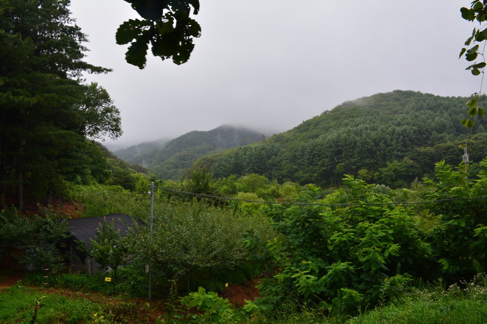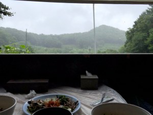 Zo kwamen we terecht bij een klein dorpje tussen de bergen. We gingen ervan uit dat het dorpje grotendeels zelfvoorzienend zou zijn. Het leek er namelijk niet op alsof er veel contact met de buitenwereld was. Dit vermoedden we, omdat er geen WiFi was 😅… Na een kort stukje lopen en even genieten van de prachtige omgeving, kwamen we uit bij, wat we dachten, een restaurantje. Aangezien alles hier in het Koreaans was en helemaal niks in het Engels wisten we het niet zeker. Gelukkig kom ik met Google translate (offline modus) een heel eind en konden we hier iets eten. We kregen een Koreaanse menukaart, dus wisten niet wat we konden eten. Op een informatiebord voor het dorp zagen we dat je hier bibimbap kon eten, dus namen we dit maar. Letterlijk vertaald betekent dit gemixte rijst. Dit is ook letterlijk wat het is. Je krijgt een kom rijst, een schaal met verschillend groenten en natuurlijk verschillende kimchi. Dit alles aten we op een traditioneel Koreaanse manier. Aan een lage tafel in een kleermakerszit. Een leuke manier om te dineren. Al vind ik een bank met voeten op de tafel net iets comfortabeler. Probeer het maar eens uit 20 minuten in een kleermakerszit met je benen tegen het tafelblad gedrukt. Gelukkig valt het wel mee als je een paar keer gaat verzitten. Daarbij komt het prachtige uitzicht, dus heerlijk kunnen eten.