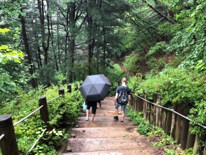 Met een goed gevulde maag en een kop koffie (deze kregen van de aardige restauranteigenaar aangeboden), vervolgden we onze weg naar boven. Dit was slechts 5 min verderop, maar het bord gaf aan 1,9 km; daar klopte iets dus niet… Vanuit hier konden we nog door naar de top, maar aangezien het al later in de middag was en we liever niet in het donker de berg af wilden, besloten we maar naar beneden te gaan. Dit was een zeer goede beslissing, aangezien het al moeilijk genoeg was in het daglicht. Vergeet niet dag het regende en je dus goed moet opletten waar je loopt, zodat je niet uitglijdt. Beneden aangekomen, namen we de bus terug naar het hostel. Hier hadden we nieuwe kamergenoten. Ik zag een gitaar en vroeg mij dus af of zij muzikanten waren. Dit waren ze inderdaad. Ze trokken van plek naar plek en verzorgden straat optredens. Vanwege de regen, besloten ze nu echter in het hostel op te treden. Misschien heb je het op Facebook voorbij zien komen? De band bestaande uit drie Koreanen? Ik verstond weinig van waar ze over zongen, maar het klonk in ieder geval erg goed. Een mooie afsluiter van de dag lijkt me.In de vorige blog schreef ik overigens nog over een gewonnen knuffel. Ik was vergeten hier nog bij te vermelden dat ik deze aan de eigenaar van het hostel had gegeven. Zij was hier erg blij mee. Ik ook, want nu hoefde ik die suuuuperleuke knuffel niet meer mee te sjouwen de rest van de reis. 😊