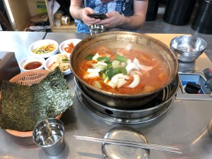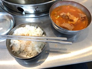 Na het bezoeken van de Cementary, zijn we gaan eten. We kwamen uit bij ene restaurantje met goede foto’s op de ramen. Binnen gekomen bestelden we Pork. Er was namelijk geen Engelse menukaart of een serveerster die het kon uitleggen. Pork begrepen ze wel. We kregen vervolgens de standaard bijgerechten en een grote kom met kokende soep, vlees en groenten. Korea zou Korea niet zijn als ze je jouw soep niet lieten knippen. Er stond een bakje op tafel met een tang, eetstokjes en een schaar; uiteraard moest ik deze eerst weer laten vallen 😅… Na het knippen van de soep, konden we gaan eten. Een beetje pittig was het wel, maar het smaakte erg goed. De smaak doet mij nog het meest denken aan een pittige tomatensoep.