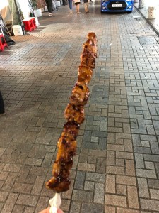 Na zo’n lange dag met een paar goede activiteiten erbij, was het hoog tijd om ons weer goed vol te stoppen. In de buurt van ons hostel is een straat waar allemaal tentjes eten verkopen. We besloten hier wat te gaan eten. We waren wel wat aan de late kant, want veel tentjes waren al aan het pakken. Uiteindelijk vonden we nog een klein restaurantje waar je goedkoop (4,50) een bak rijst met vlees erop kon eten. Het vrouwtje was nogal karig met het vlees, dus lustte ik nog wat. Ik kocht onderweg nog een kip spies. Ik had die dingen al vaker gezien en was wel nieuwsgierig naar de smaak. De spiesen zijn al voorgegaard en worden daarna op kolen nog gegrild. Tijdens het grillen gaan er nog een paar sausjes op en eet smakelijk!
