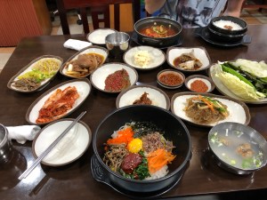 Stephan had een tentje gevonden die de beste zou smaken, dus die gingen we maar eens proberen. Wederom was het eten goedkoop. Voor 10.000W (7,50 euro) werd de hele tafel volgezet met bijgerechten. Daar moest ik natuurlijk alles van proberen. De bibimbap zelf was niet heel bijzonder. Het smaakte prima, maar niet speciaal. Wat ook op tafel stond was sojasaus krab. Deze had ik al eens voorbij zien komen op Gwangjong Market (Seoul), maar wilde ik toen niet proberen. Nu was dan de kans om het toch uit te proberen. Ik was wat huiverig, maar moest het geprobeerd hebben. Ik wist al niet goed hoe ik het moest eten. Ik pelde de schaal er dus maar wat vanaf. Vervolgens kwam er allemaal slijmerige rotzooi los. Echt niet dat ik dat ging eten. Toch nog even verder gekeken. Er moet toch ook ergens krabvlees zitten lijkt me? Uiteindelijk vond ik wel wat. Ik probeerde het te eten, maar kreeg het niet weg. De vieze slijmerige structuur… 😖