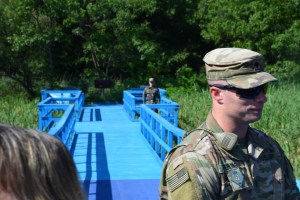 Eenmaal aangekomen bij de JSA, liepen we door het Peace House. Hier kregen we nogmaals instructies om geen provocerende dingen te doen richting soldaten of Noord-Korea. Geen gekke uitingen, niet zwaaien o.i.d. We moesten daarna een rij maken, twee aan twee en liepen naar de eerste locatie. Tijdens het lopen mocht je overigens ook geen foto’s maken. Onderweg kwamen we Zuid-Koreaanse soldaten tegen. Deze soldaten stonden de hele dag op hun plaats in de brandende zon (vandaag 32 graden). We kwamen uit op de footbridge. Dit is een blauwe brug. De reden dat de brug blauw os, is omdat het in de kleur van de VN (Verenigde Naties) is geschilderd. De sergeant had hier niet iets speciaals over te vertellen. Het was vooral interessant omdat president Moon en Kim Jung Un hier overheen gelopen hebben.