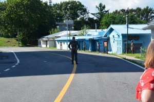 Als eerst komt je langs checkpoint B. Hiervan mochten we geen foto’s maken; wel van het hek. Dit is dus de officiële grens van de DMZ. Onderweg vertelde de sergeant het e.e.a. over de omgeving. Zo ook over de gevaarlijkste golfbaan ter wereld met 3 mijnenvelden eromheen. “If you don’t believe me, Google it”. Dat heb ik dus gedaan en het bestaat echt. De golfbaan bestaat slechts uit 1 hole, maar dan wel een gevaarlijke. We kwamen ook langs de vlaggenmasten, waar de sergeant vertelde over de lege huizen.