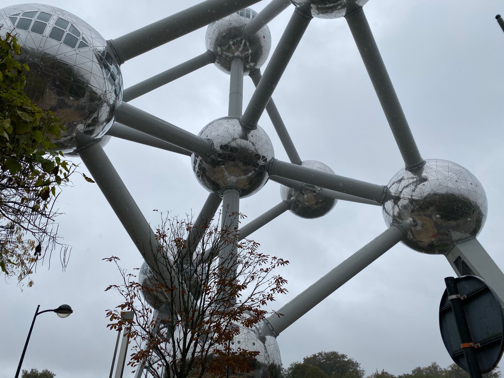 Na een ontbijt gingen we naar ons eerst (en ook wel een beetje laatste) bezoekje van Brussel. We pakten de tram naar het Atomium. Zoals je misschien al wel kunt bedenken is dit een beeld (kunstwerk?) van een atoom. Het is ooit gebouwd voor een van de wereldtentoonstellingen die hier gehouden is; net als de Eiffeltoren dat bijvoorbeeld is. Ik had al wel foto’s gezien op internet over het gebouw, maar kon hier nog geen plaatje aan koppelen hoe hij er in het echt uit zou zien. Na een korte metro trip daar aangekomen, waren we eigenlijk lichtelijk verbaasd. Het gebouw was namelijk een stuk groter dan we verwacht hadden. Met een hoogte van 102 m, is het aan de grotere kant. We konden ook tickets kopen om naar boven te gaan. We zeiden al dat we dit zouden doen als het 5 – 7,50 euro zou kosten. We vermoeden dat wij dit redelijk kunnen inschatten met alle attracties die we tot dusver met onze reizen hebben bezocht. De prijs viel uiteindelijk tegen. Het was 15 euro per persoon. Als we nog studenten passen hadden, betaalden we slechts 8 euro; maar helaas…