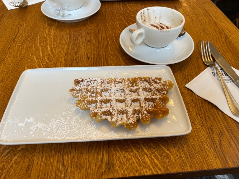 Na deze interessante afwijking van de route, besloten we te gaan genieten van een aantal Belgische specialiteiten. Te beginnen met de wafels. Hier kan onderscheid gemaakt worden in twee varianten. De Brussels wafel enerzijds en de Luikse anderzijds. De Luikse wafel is wat zoeter met meer vulling, terwijl de Brusselse een wat krokantere korst heeft. Uiteraard ben ik opzoek gegaan naar de beste wafel in Brussel. Zo kwamen we bij een tentje genaamd Maison Dandoy. Dit was ook een café. Nu hadden we best zin in een warme wafel met een lekker kopje koffie na een tijdje in de regen te hebben gelopen. Binnengekomen waren we als eerst aan de beurt en bestelde ik een wafel met poedersuiker en een cappucino; van de koffie hebben ze alleen Americana, maar die vind ik te waterig. Binnen 1 minuut stond alles klaar. Toen ik vroeg of ik hiermee ook boven kon zitten was het antwoord nee. Dan moest ik boven bestellen. Is goed, geen probleem, doen we dat.