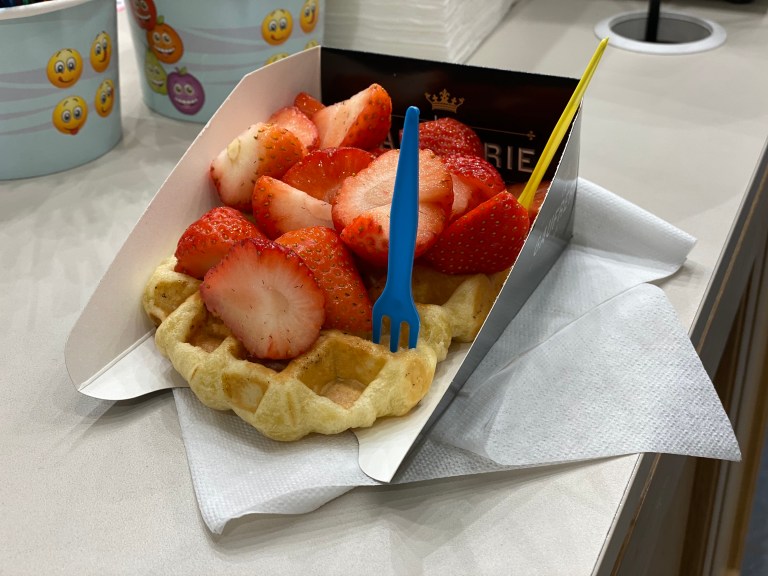 Ik ben dus terug gelopen naar de serveerster en gaf dit aan. Ze leek zich zichtbaar te schamen en verontschuldigde zich. Ze gaf aan nieuwe te laten komen. Zo’n 10 min later kregen we eindelijk nieuwe; nog steeds geen wafel trouwens. De nieuwe cappucino kon net. Het was wel warm, maar niet echt. De wafel kwam uiteindelijk ook. Ik vroeg mijzelf uiteindelijk een ding af. Hoe kan dit zolang duren? Beneden hadden we alles binnen 1 minuut (niet overdreven). In hetzelfde restaurant hebben we boven 30+ minuten gewacht. De wafel hoefde alleen maar opgewarmd te worden en de cappucino ging via een apparaat. Hoe moeilijk kan dat nou zijn…? Wat uiteindelijk wel netjes was, is dat we het drinken niet hoefden te betalen, aangezien het tot twee keer toe niet goed warm was.
