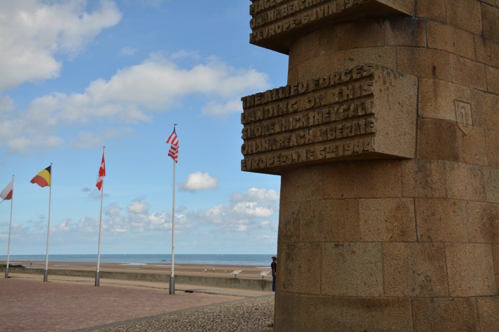 Het was een klein half uurtje rijden naar Omaha beach. Dit start al met de mooie landschappen van Normandië. Het is alleen wel jammer dat alles nogal vergeeld is. De zon schijnt hier immers best wel veel. Opvallend is dan ook de vele maïsvelden waar je langsrijdt. Na de auto geparkeerd te hebben, vroegen we ons af of we wel op de goede plek waren… We zagen namelijk wel een boulevard met een strand en een groot beeld, maar verder niks. Ik had ergens verwacht iets van ruïnes ofzo te zien, maar er was niet echt iets. Er was wel een herdenkingsbeeld geplaatst en een aantal informatieborden langs de rand. Wat je wel kreeg was een bepaald gevoel. Als je naar de zee kijkt en je inleeft in wat een Duitse soldaat hier gezien zal hebben. Een enorme invasie aan schepen dat je tegemoet vaart. Ook vanuit een ander perspectief gekeken. Ben je een (vaak jonge) soldaat die op de stranden afvaart en alleen maar enorme bunkers ziet. Niet wetende wat het strand je gaat brengen. Dit gedachten maken wel indruk als je daar loopt; en vooral als je je beseft dat dit 76 jaar terug daadwerkelijk heeft plaatsgevonden. We besloten uiteindelijk om een stuk over het strand te lopen. Schoenen uit en met de voeten even lekker in het water.