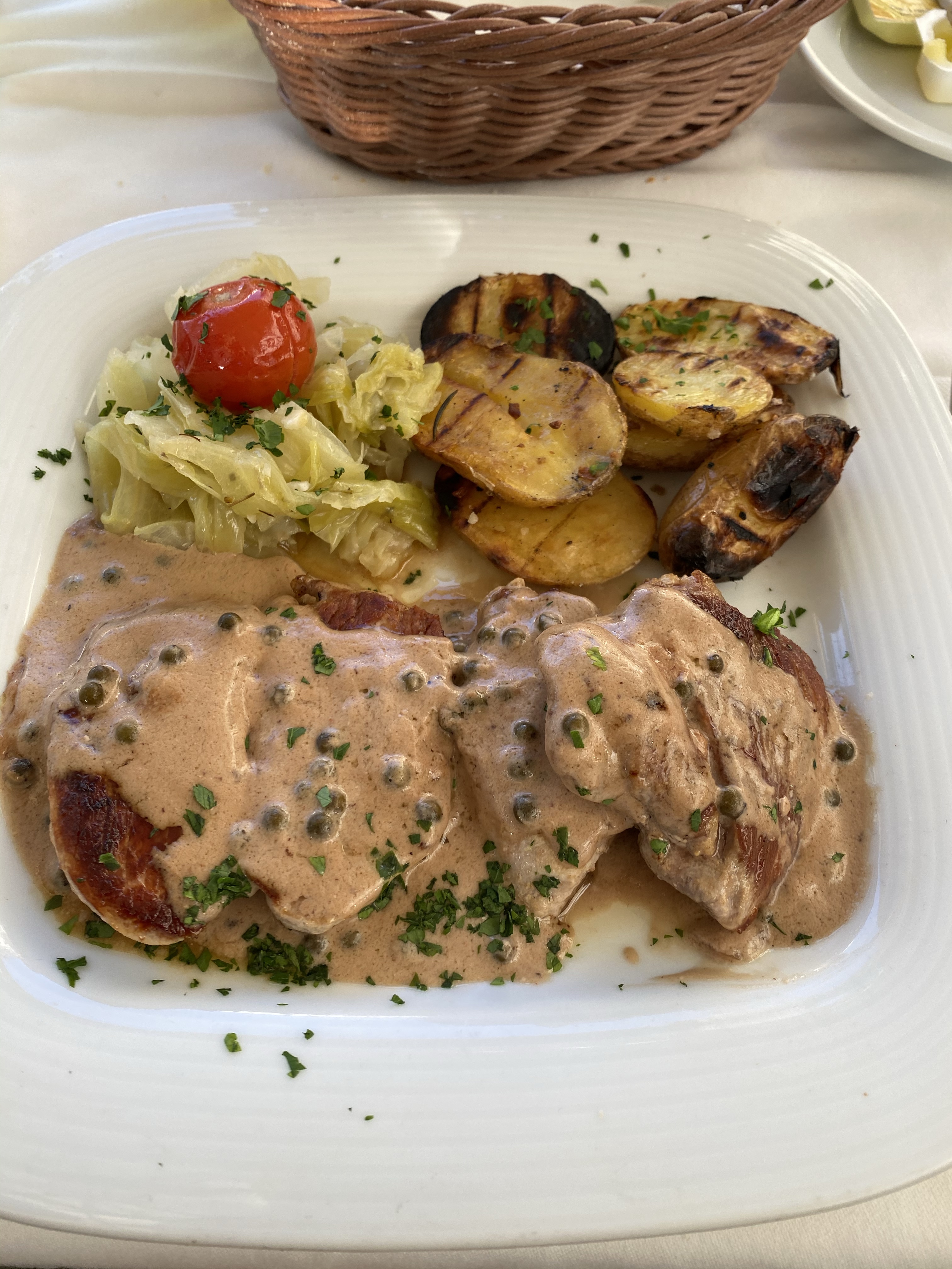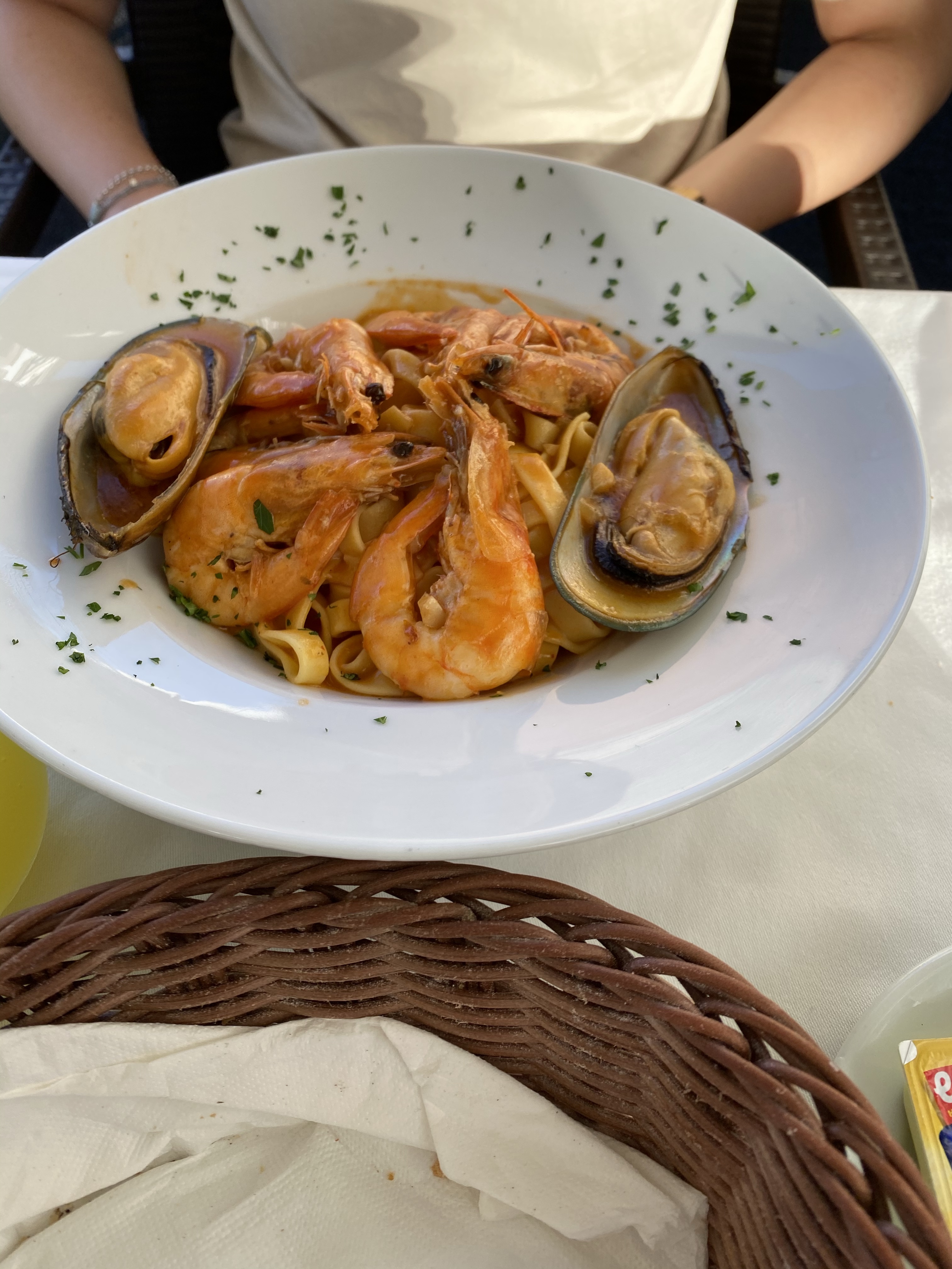 Uiteindelijk kregen we het. Ik had varkenshaas met pepersaus en Robin een tagliatelle met zeevruchten. De varkenshaas was hartstikke droog. Het werd geserveerd met kleffe droge aardappels die eruit zagen alsof ze met de magnetron opgewarmd waren (ik weet ook bijna zeker dat dit het geval was). En er zal iets van kool bij, maar daar begin ik maar niet over… Robin had tagliatelle met 2 grote uitgedroogde mosselen aan de zijkant en een assortiment ongepelde garnalen. Lekker eten zo’n pasta. Ik had de garnalen nog voor haar gepeld om te kijken of het wat was, maar het smaakte nergens naar. Gewoon rubber… Er kwam wel een sterke vislucht vanaf. Mijn gok was dat de “zeevruchten” uit de diepvries kwamen. Dit restaurant had zo in Kitchen Nightmares met Gordon Ramsay gekund…
