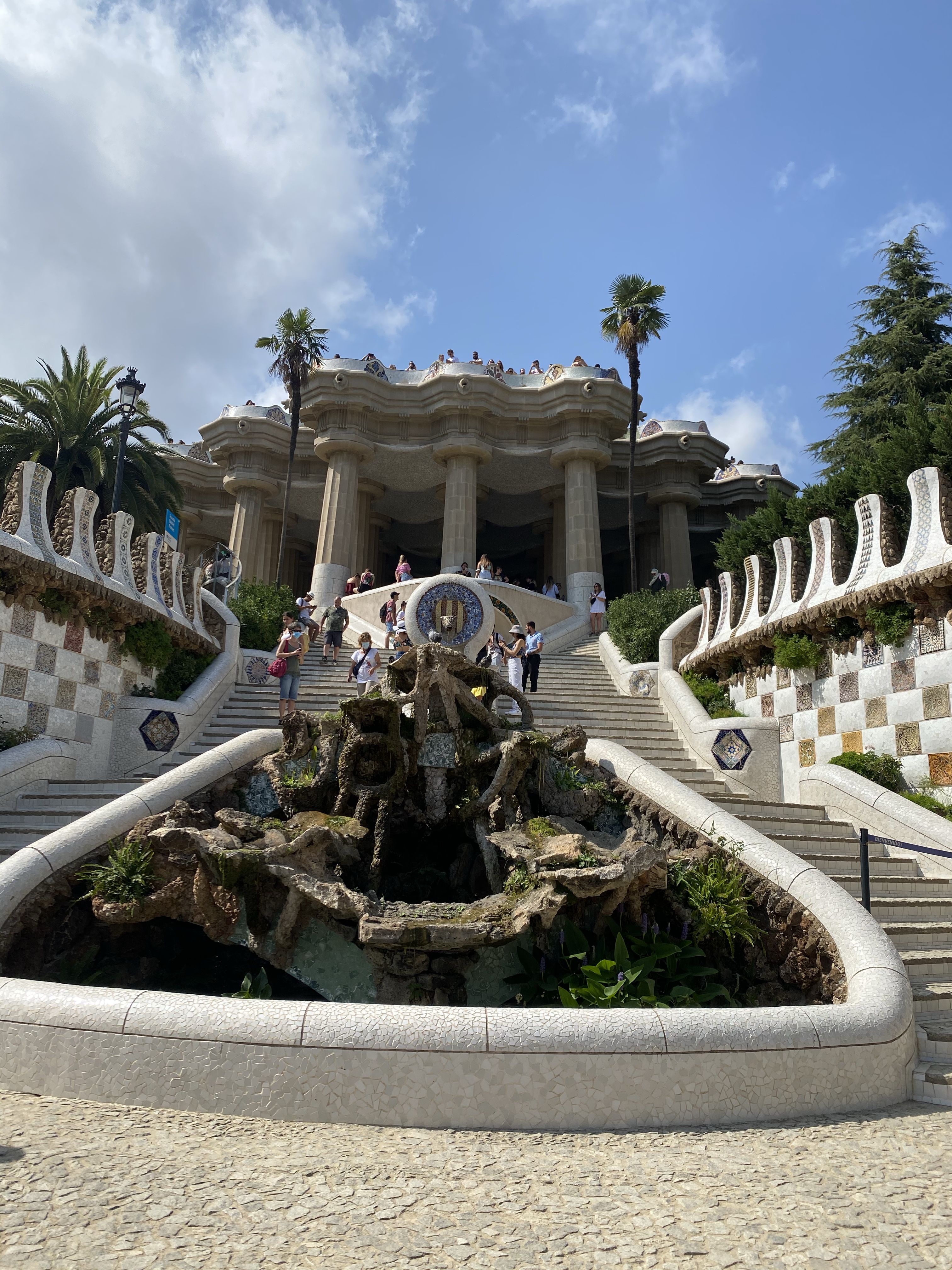 Uiteindelijk kwamen we bij de ingang van het park. Met de kaartjes konden we naar binnen. Het was mij niet helemaal duidelijk of je het park überhaupt zonder een kaartje nog wel in kwam. Ik kon de vorige keer namelijk wel een groot deel van het park in zonder kaartje. Nu leek er bij elke ingang/uitgang een bewaker te staan. In het midden van het park vind je de werken van Gaudi. De verschillende werken doen mij altijd een beetje denken aan iets uit een sprookje. De werken zien er erg fantasierijk uit. Dit maakt voor mij dan ook dat ik het werk van Gaudi erg mooi vind. Ondanks dat het er erg mooi uitziet, vind ik het toch een beetje tegenvallen. Ik had, vooral voor het geld dat we betaalden, verwacht meer te kunnen zien. Toch zou ik zeggen dat je dit een keer gezien moet hebben als je hier bent. Dan kan ik dit in ieder geval wel afvinken. Het was wel leuk om hier doorheen te zijn geweest.