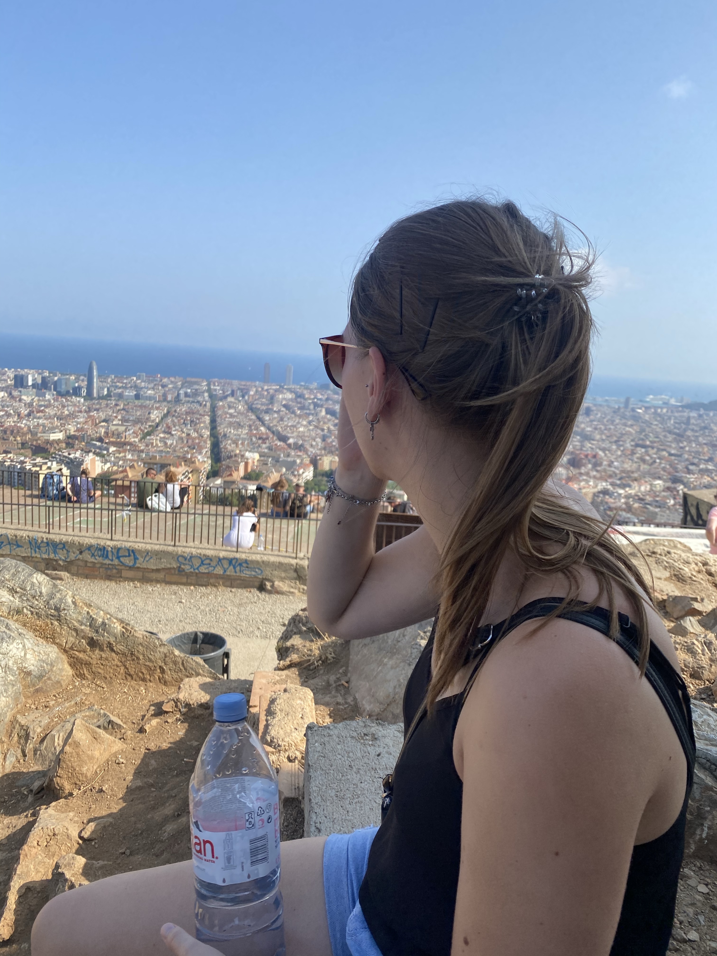 Vanuit Park Guel hadden we nog een locatie te gaan, namelijk bunkers del Carmel. De bunkers zelf zijn niet zo bijzonder. Ik vind vooral het uitzicht dat je vanaf deze plek hebt erg mooi. Het ligt niet onwijs hoog, maar je hebt wel een goed uitzicht over de stad. Ten opzichte van de berg Tibidabo, waar we gisteren waren, vind ik deze plek mooier. Het mooie van deze plek is dan ook dat het gratis is. We hebben hier even gezeten en gewoon lekker genoten van het uitzicht. Natuurlijk wel in de schaduw, want de zon was mij te warm. Daarbij wilde ik liever niet verbranden. Van al het wandelen de heuvel (berg?) op, was mijn shirt doordrenkt van het zweet. Ik had mijn shirt dus uitgedaan. Mensen om mij heen zetten hierdoor snel hun zonnebril op of keken weg. Ik denk dat ze verblind raakten door mijn witte huid…