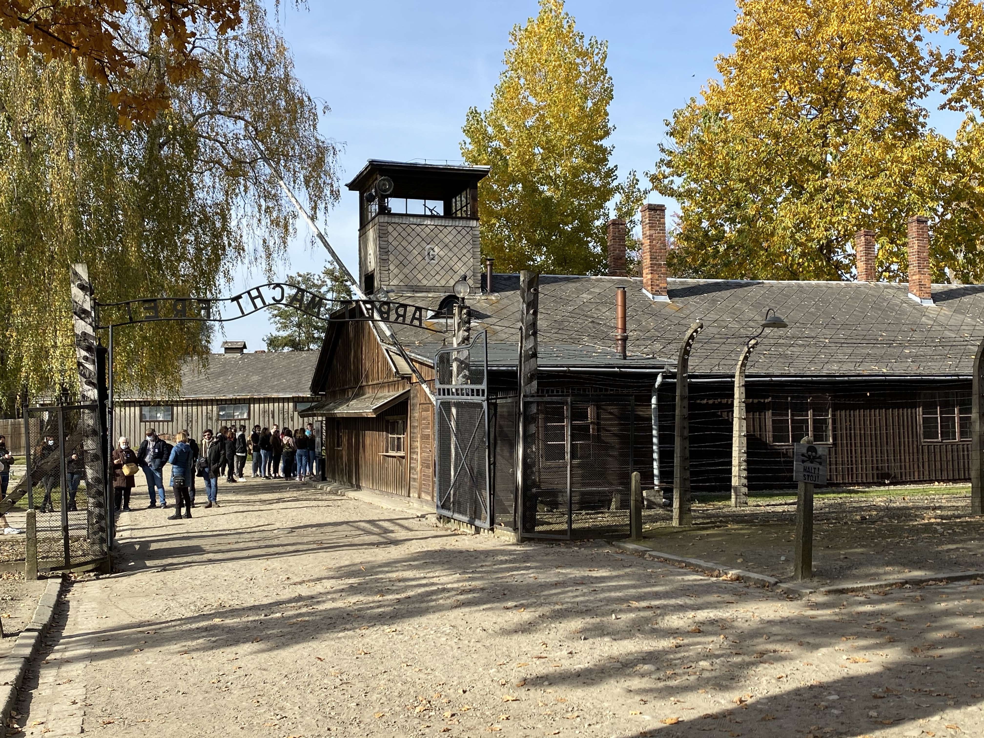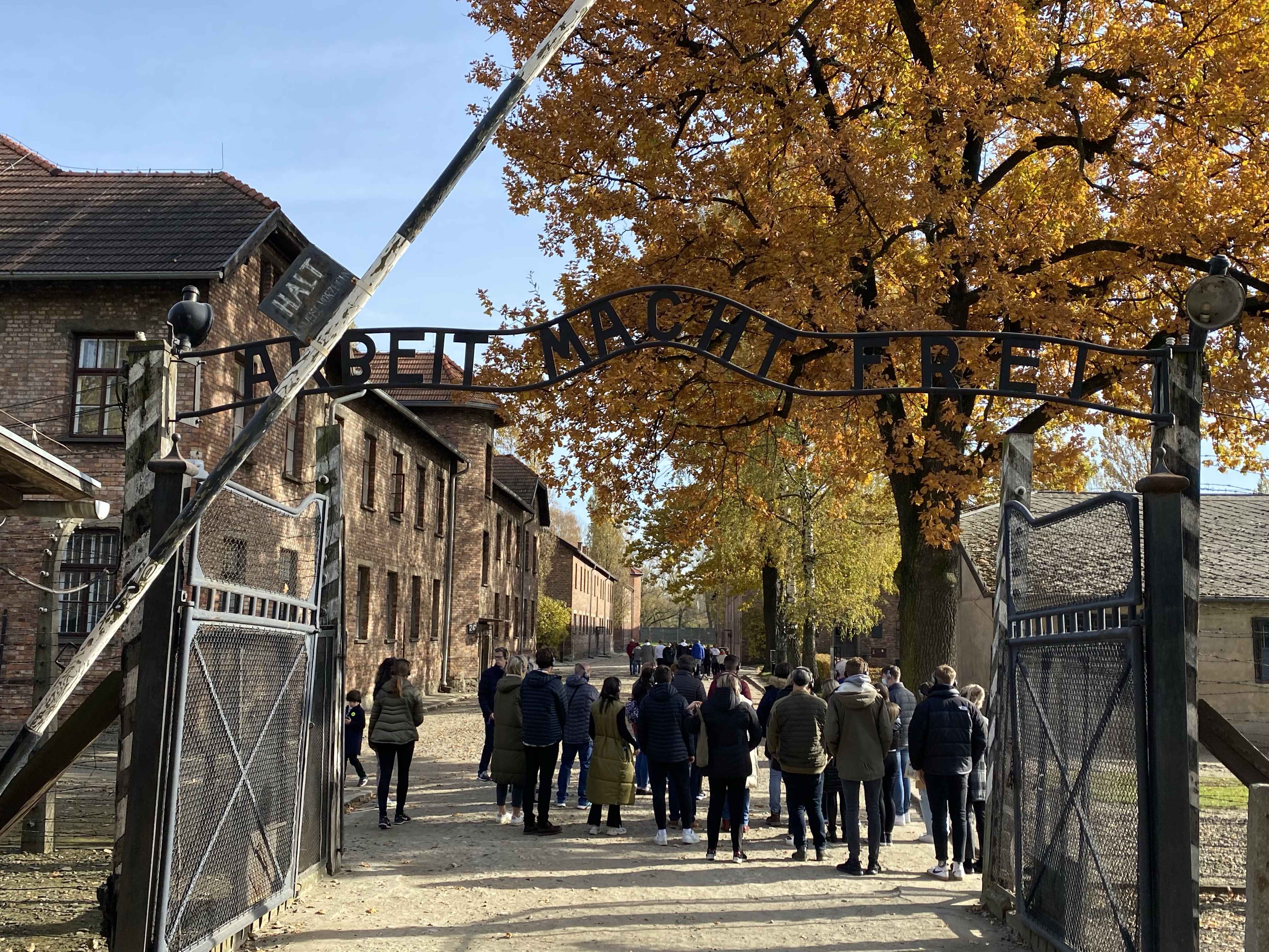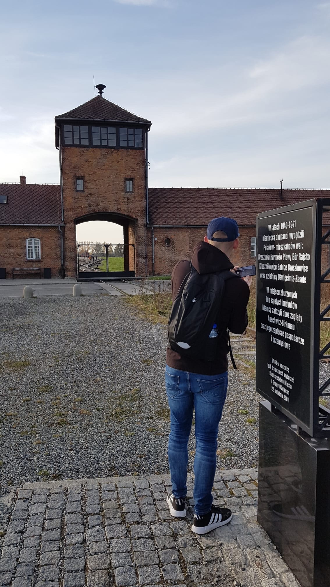 Na iets meer dan 1 uur en 40 minuten rijden (ja, het was een beste rit in die kleine bus), kwamen we aan bij het museum Auschwitz. Althans, op 10 minuten afstand. Voor de deur afzetten is teveel luxe. Na een stukje lopen waren we er dan eindelijk. Voor je tickets kon kopen ging je eerst door een tassen controle en door een metaaldetector. Weet je nog dat flesje water? Bij de controle moest ik mijn tas in een bak leggen. Het paste niet helemaal, dus wilde ik mijn tas er beter in duwen. Spoot vervolgens dat water er weer uit. Die vrouw van de controle snel opzij springen om niet nat te worden en mij waarschuwen voor het flesje. Owhja (alweer)… We konden gelukkig nog tickets kopen, maar dit was dan wel in een groep met een guide in het Engels. Prima! We waren al lang blij dat we mee konden. We begonnen de tour met een inleidende film. Daarna naar buiten om de tourguide te ontmoeten. We kregen geen naam o.i.d., het was gewoon hallo. We zetten de hoofdtelefoon op en konden haar goed verstaan. Zij praatte in een microfoon, zodat wij haar met de hoofdtelefoon konden verstaan.