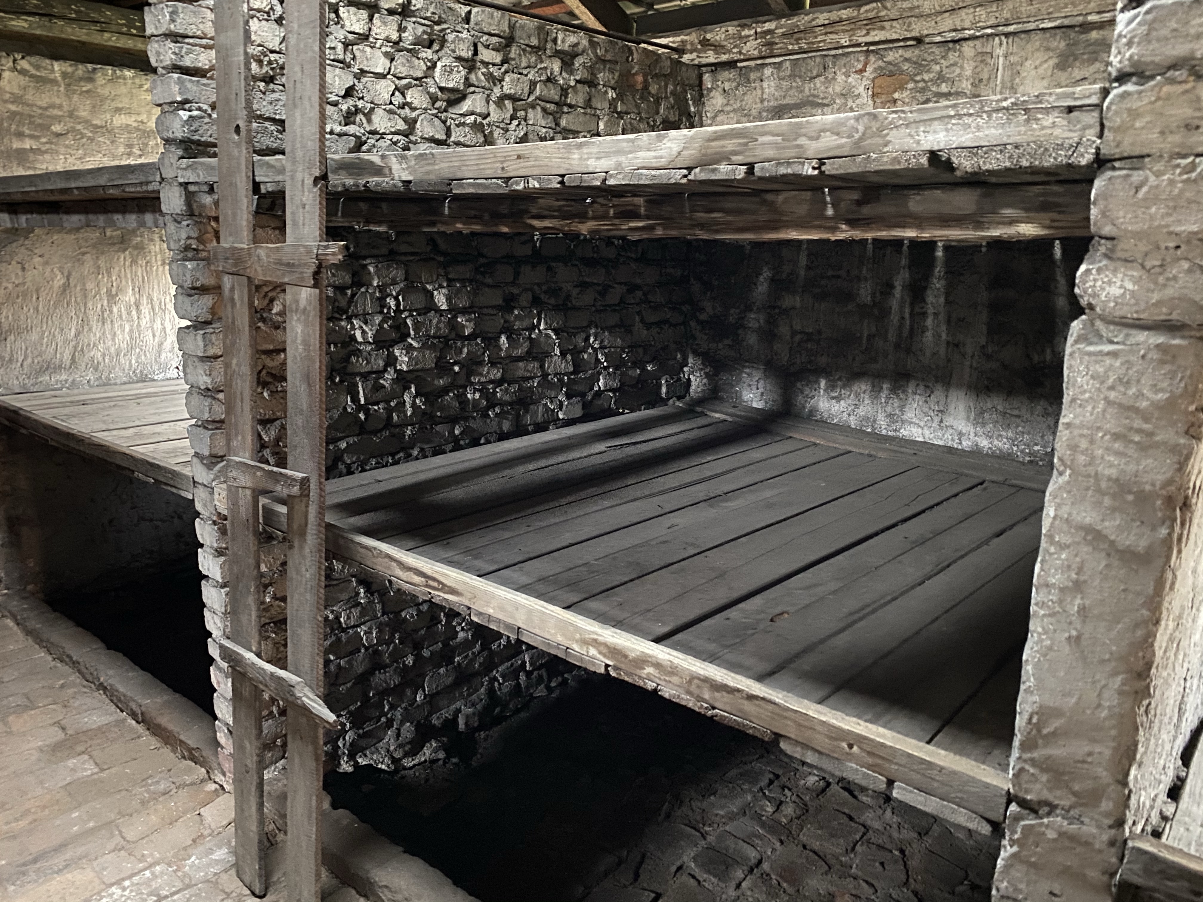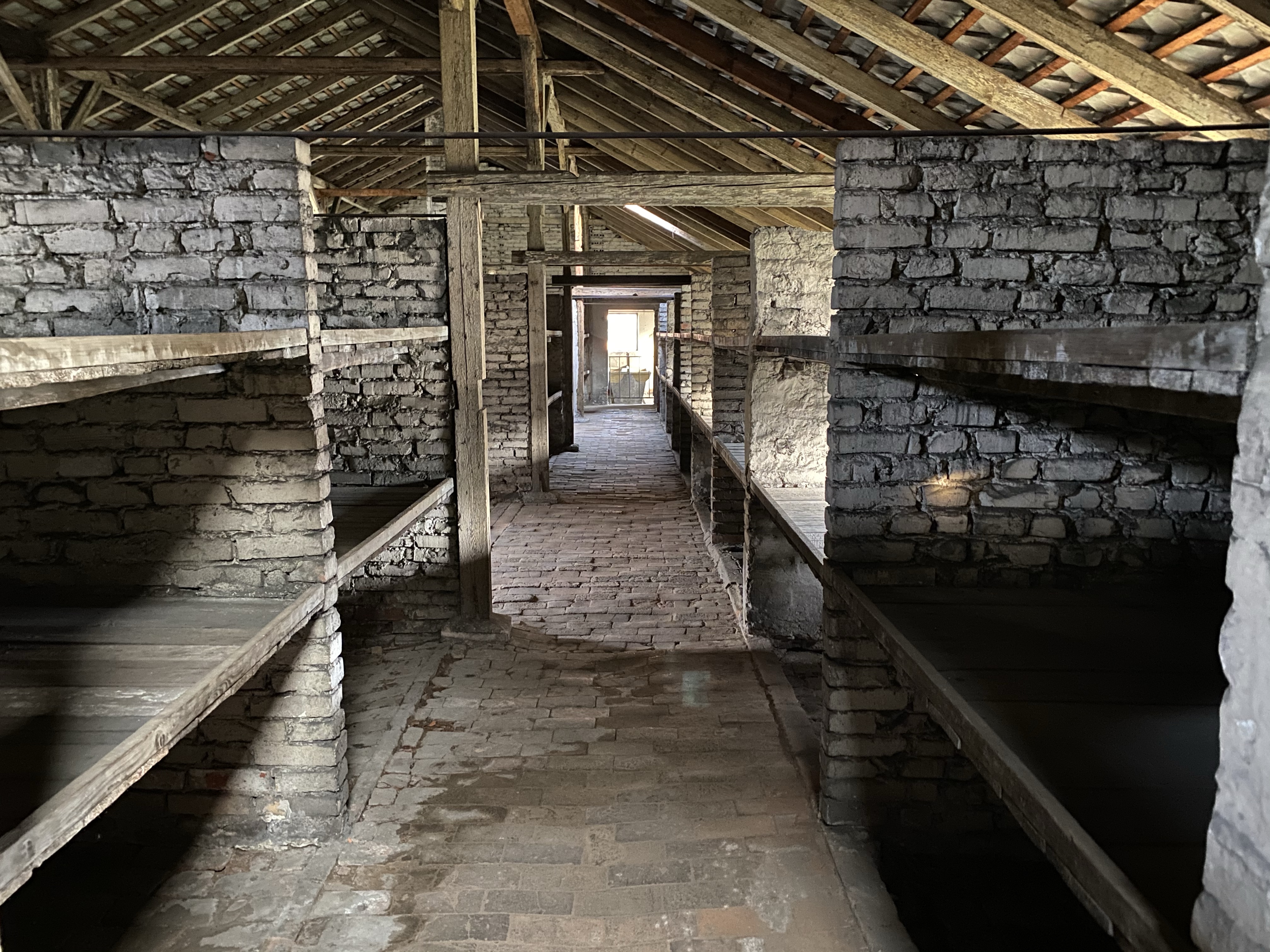 Na het perron en de gaskamers, gingen we als laatst langs de barakken waar de mensen sliepen. Ook hier weer vraag je je af hoe dit heeft kunnen plaatsvinden. Op 1 “bed” sliepen 4-6 mensen. Je kan het niet eens een bed noemen. Het zijn gewoon een paar planken. In een barak werden al gauw tot 600 mensen gestopt. Al deze mensen leefden op elkaar huid. Bizar om je zoiets te bedenken. De tour werd uiteindelijk afgesloten met een aantal ontsnappingsverhalen. Hier had een van de ontsnapte mensen overigens ook een boek over geschreven. De tourgids raadde dit boek zeker aan. Als we de gids op haar woord hadden moeten geloven hadden we inmiddels al een stuk of 8 boeken moeten kopen. Ze vertelt verschillende verhalen uit de boeken en benoemt dan de Engelse naam van het boek. Elk boek prijst ze aan met: “I strongly recommend you buying this book!” Tuurlijk, net als de vorige 7…