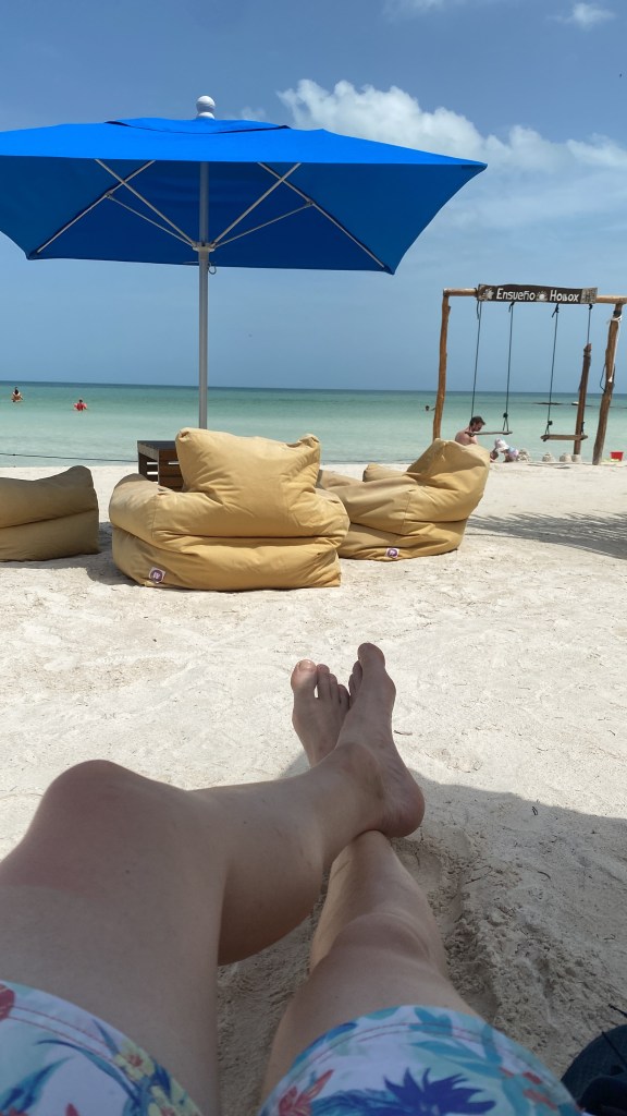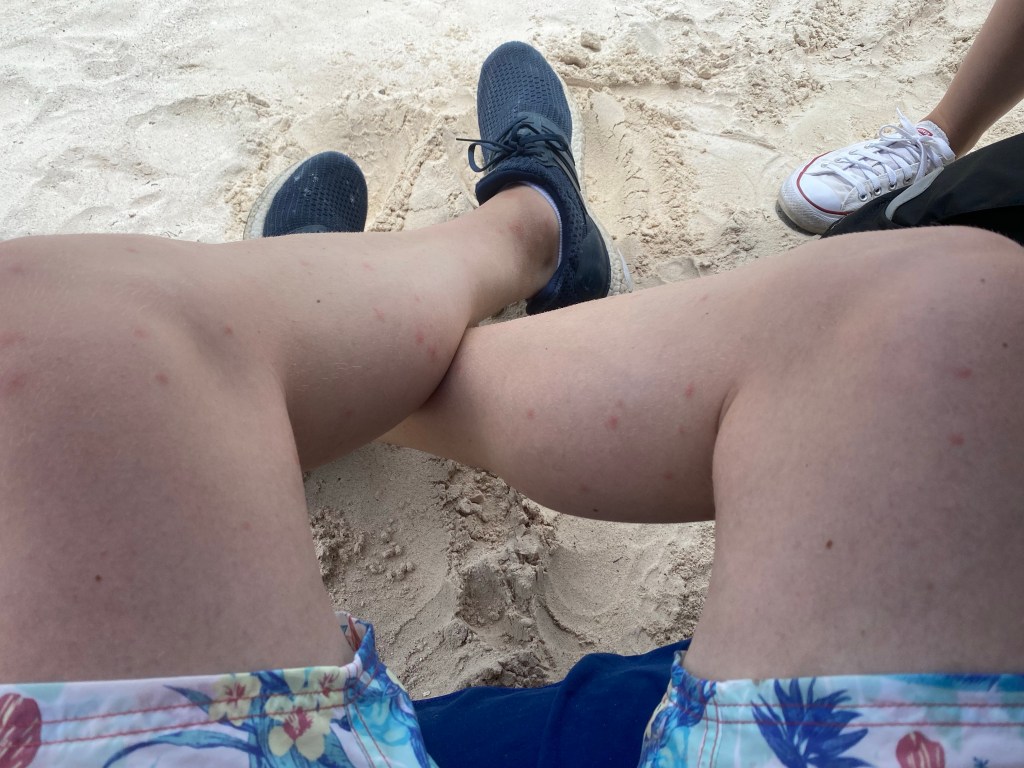 Na het ontbijt zijn we teruggelopen naar de camping om een tour te boeken. We wilden een tour door de moerassen, zodat we flamingo’s en krokodillen konden zien. Helaas is deze alleen ‘s ochtendsvroeg (07.00) of aan het eind van de middag. De ochtend konden we niet meer redden, dus werd het de middag. Helaas ging deze niet door, vanwege een oprukkende wind uit het oosten… Toen werd het de 3-eilanden tour. Je zou het niet verwachten, maar met deze tour ga je langs 3 eilanden. Op een van de eilanden vind je dan ook een cenote; dit is een water bevattende grot of poel (Wikipedia). Je moet het zien om een beeld te kunnen vormen (haha). De tour begon om 14.00, dus moesten we nog wat tijd overbruggen. Dit deden we aan het strand. Het zal niet vaak voorkomen dat ik dit doe, want ik ben geen strand fan… Ik ben er wel achter dat dit vooral het stuk na het strand is. Toen we daar (de beach club van gisteren) zaten/lagen was het echt lekker. Het is vooral de tijd daarna. Dat je overal zand vindt en je lichaam droog voelt door het zoute zeewater. Ohja, en aangezien ik nogal snel verbrand is zwemmen in de zee geen aanrader. Ik heb er nog geen 5 minuten in gelegen of mijn (ingesmeerde) schouders en borst waren al verband. Zucht… Ik zag op het strand trouwens ook dat de plekken waar wij gestoken zijn rood werden. Hieronder een foto van alleen mijn benen voor het idee.