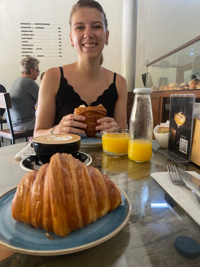 Onze eerste stop is bij Soco. Dit is een modern bakkertje in Merida. We verwachtten hier alleen broodjes te kunnen eten, maar het menu is een stuk uitgebreider dan dat. Aangezien we wel zin hadden in een relatief normaal ontbijt, namen we beiden een croissant. Daarna bestelden we nog yoghurt met fruit en granola. Dit alles zorgde voor een goed ontbijt. Ook hier was het personeel weer onwijs vriendelijk en behulpzaam. Dit vinden we sowieso in Mexico. De Mexicanen zijn erg vriendelijk en proberen je ook echt te helpen ondanks de (toch wel vaak) aanwezige taalbarrière. Ook over straat worden we vaak vriendelijk begroet door onbekende Mexicanen. Erg leuk!