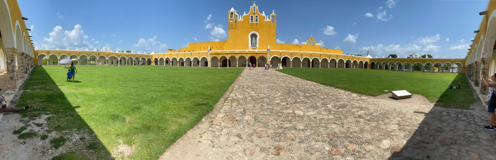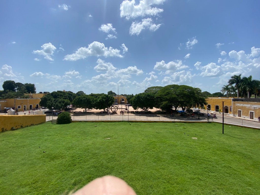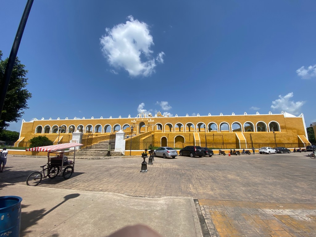 Voor we weg gingen kochten we nog een aantal extra broodjes voor de lunch. Nu konden we dan echt op pad naar onze volgende locatie. We namen dit keer de bus naar het plaatsje Izamal. Wat dit plaatsje bijzonder maakt, is dat het grootste gedeelte van de gebouwen in de stad geel geverfd is. Er is niet persé veel te doen in de stad. Wij brachten als eerst een bezoek aan de kerk. Hier loop je zeg maar tegenaan als je de straat van het busstation uitloopt. Het is dan misschien een kerk, maar doet je in de eerste instantie helemaal niet denken aan een kerk. Je loopt een trap op naar de binnenplaats. Vanuit hier heb je rondom zicht over de stad. Achterin de binnenplaats kun je de kerk inlopen. Dit hebben wij overgeslagen. Door alle reizen heen heb ik al genoeg kerken gezien. Bij de laatste paar liep ik vaak al snel weer naar buiten.