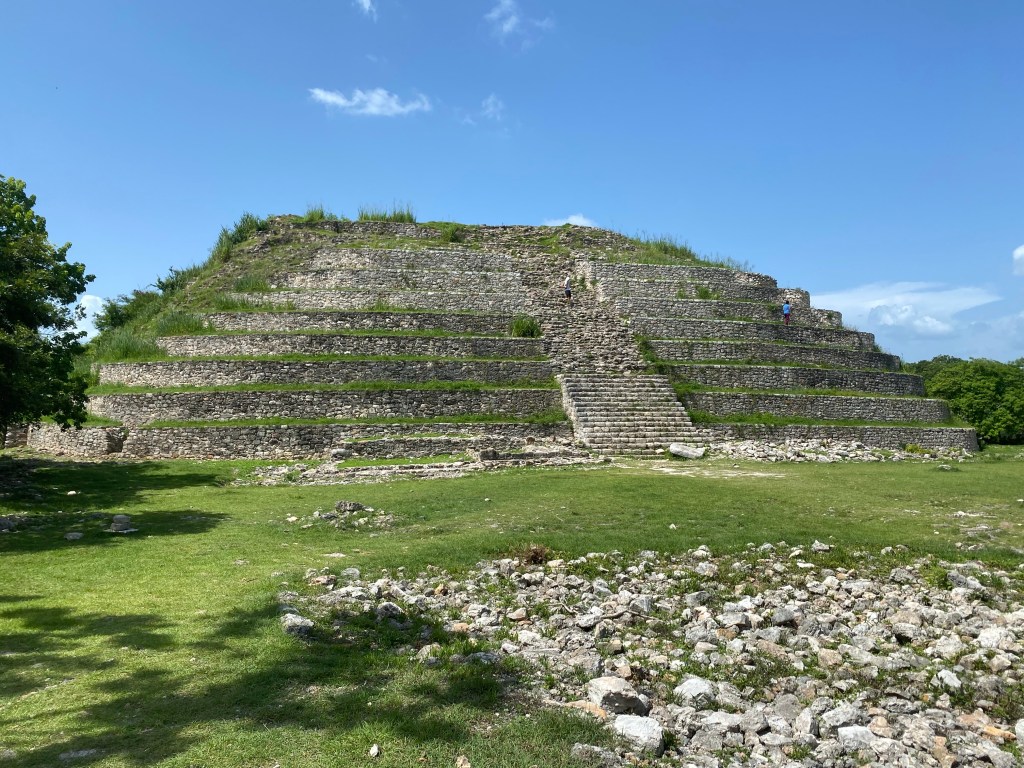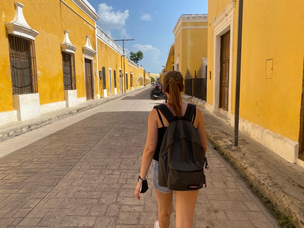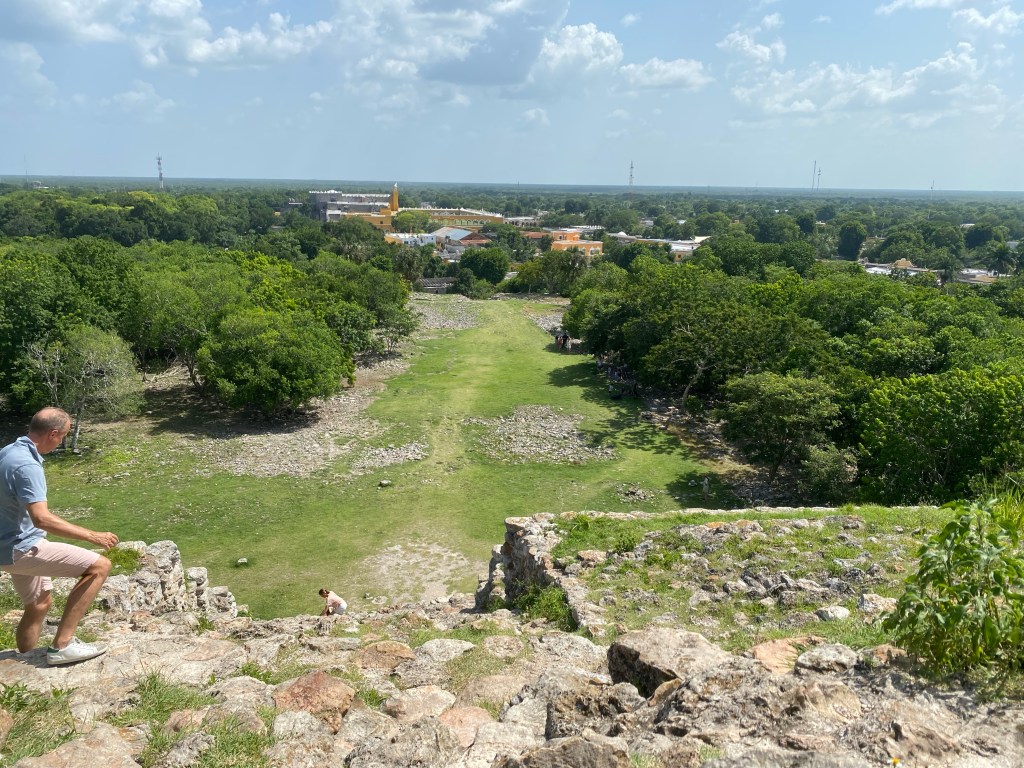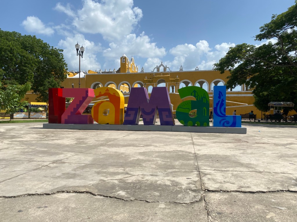 Vanuit de kerk loop je door naar plaza Izamal. Hier vind je de felgekleurde letters met de naam van deze stad. Rondom zijn verschillende restaurantjes en kraampjes te vinden. Ik ben er nog niet helemaal achter waarom in elke plaats de plaatsnaam met fel gekleurde letters te vinden is. De felle kleuren komen sowieso wel naar voren in alle steden. Misschien is het gewoon een leuke toevoeging aan de stad? Vanuit het plein zijn wij doorgelopen naar Piramide Kinich Kakmo. Dit is een oude Maya piramide. Je kunt hier ook naar boven, zodat je een mooi uitzicht over de gele stad hebt. De piramide zelf is niet heel goed onderhouden. Een groot deel van de trap is kapot. Je kon echter nog goed omhoog klimmen.
