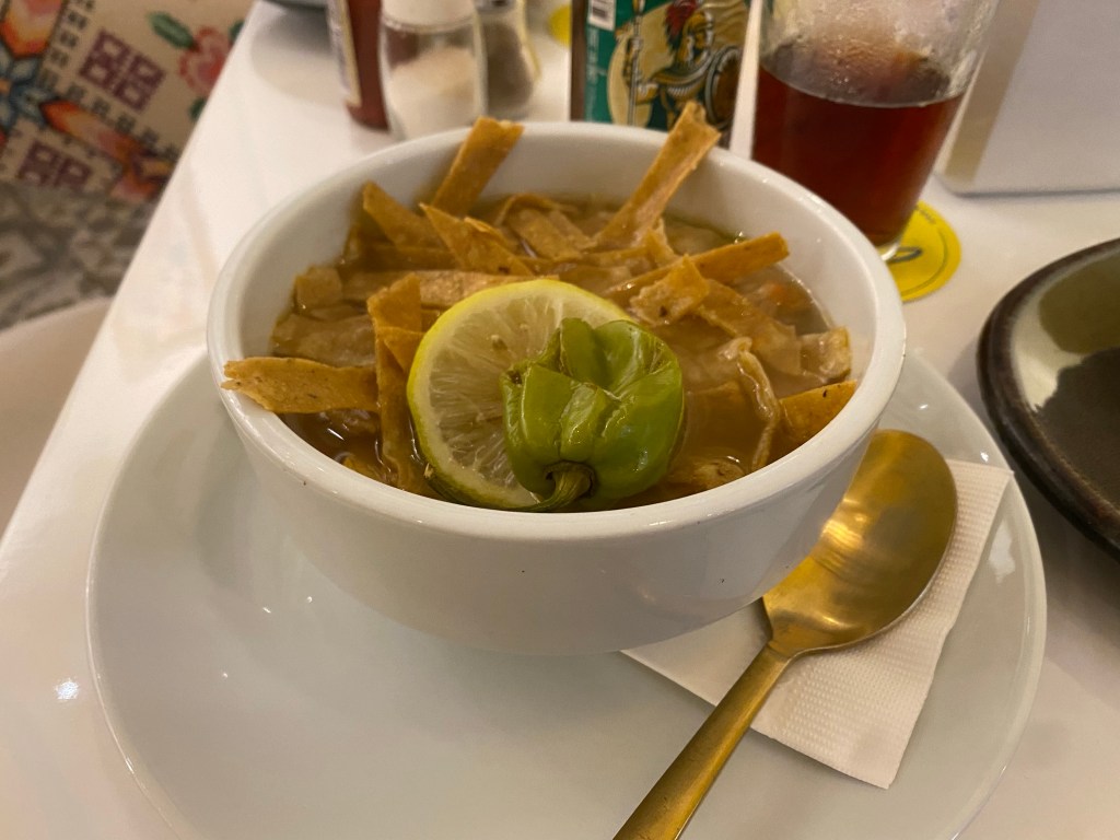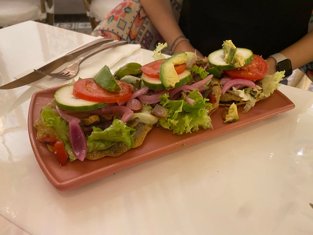 Als avondeten bestelde Robin panuchos. Dit was een vegetarisch gerecht met sla, tomaat, komkommer, ui, champignons, paprika, avocado geserveerd op gebakken tortilla’s. Ik had sopa de lima en fajita’s. De sopa is een limoensoep gevuld met kalkoen en tortilla. Het heeft een verfrissende licht zure smaak. De fajita’s ken je vast wel. Kort in een hete grilpan gebakken vlees, ui en paprika. Geserveerd met kaas eroverheen. Een prima maaltijd om de dag af te sluiten.
