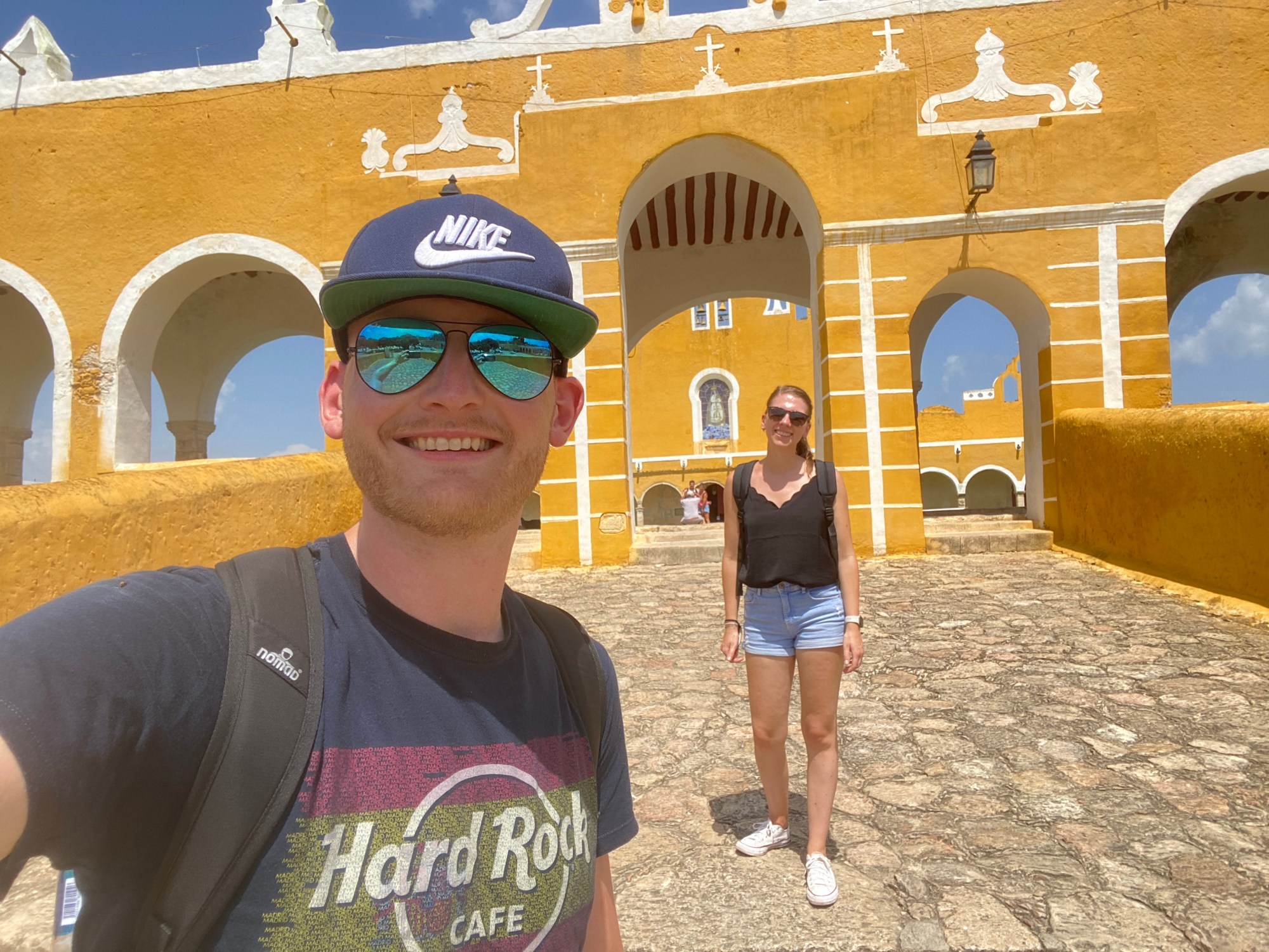 Voor we weg gingen kochten we nog een aantal extra broodjes voor de lunch. Nu konden we dan echt op pad naar onze volgende locatie. We namen dit keer de bus naar het plaatsje Izamal. Wat dit plaatsje bijzonder maakt, is dat het grootste gedeelte van de gebouwen in de stad geel geverfd is. Er is niet persé veel te doen in de stad. Wij brachten als eerst een bezoek aan de kerk. Hier loop je zeg maar tegenaan als je de straat van het busstation uitloopt. Het is dan misschien een kerk, maar doet je in de eerste instantie helemaal niet denken aan een kerk. Je loopt een trap op naar de binnenplaats. Vanuit hier heb je rondom zicht over de stad. Achterin de binnenplaats kun je de kerk inlopen. Dit hebben wij overgeslagen. Door alle reizen heen heb ik al genoeg kerken gezien. Bij de laatste paar liep ik vaak al snel weer naar buiten.