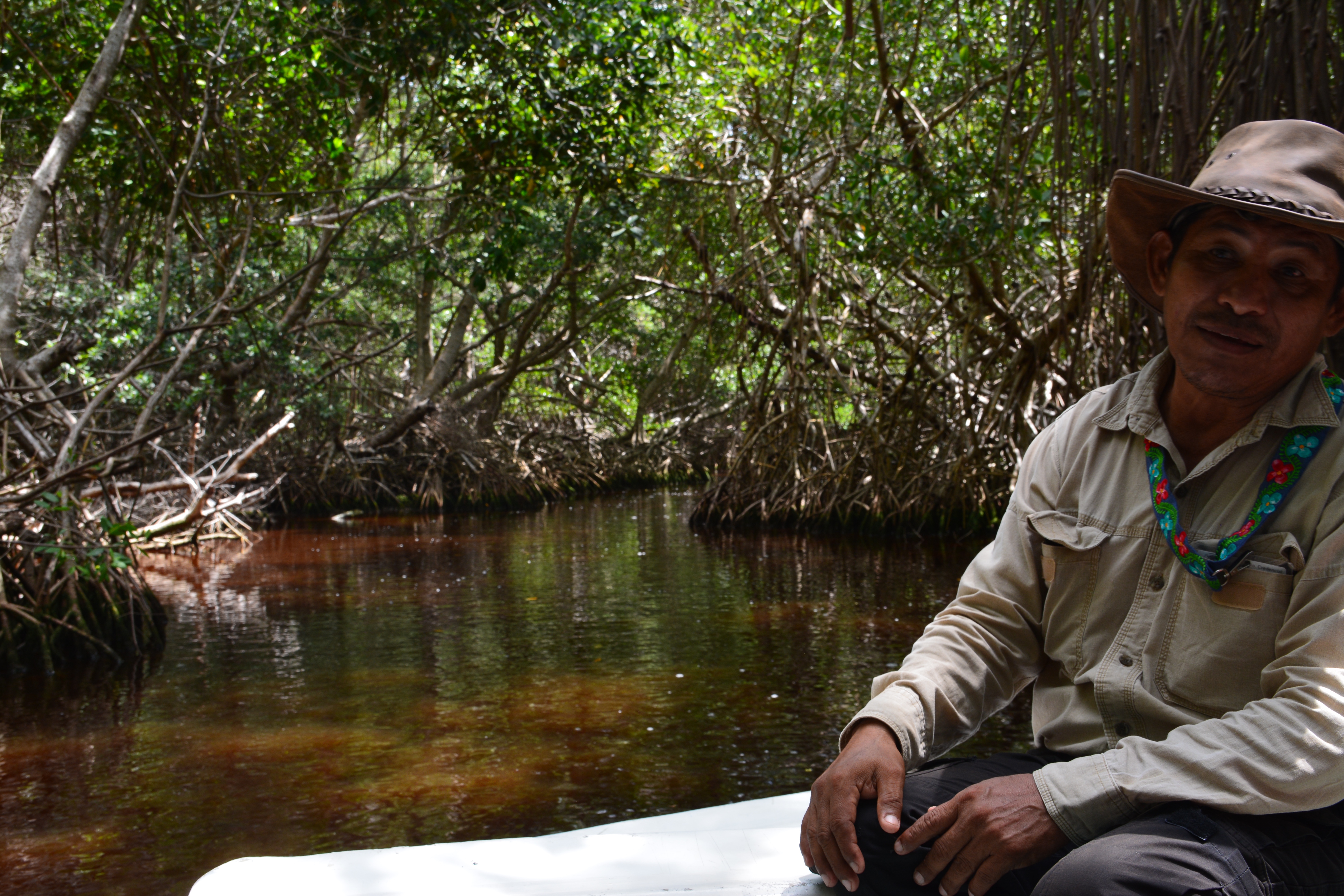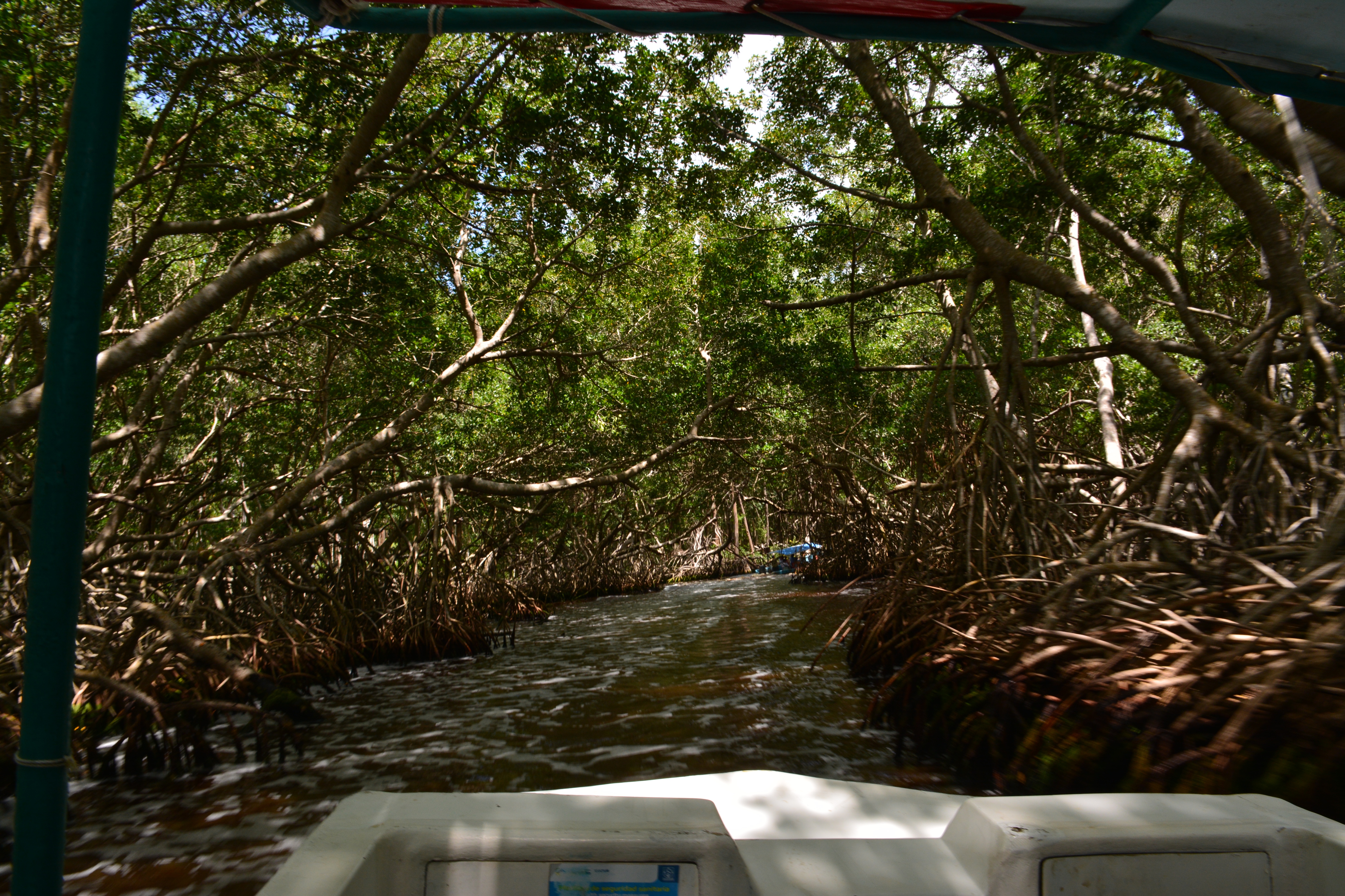Na de flamingo’s voeren we verder. Onze volgende stop was een ritje door de mangrove. Terwijl we hier doorheen voeren, vertelde Alberto over het wild wat hier leeft. Je kan hier krokodillen, boa’s (dan bedoel ik de slangen) en met geluk jaguars (de katachtige) tegenkomen. Robin meteen helemaal in paniek. Ze hoorde dat er slangen konden zitten. Geen zorgen, geen zorgen. Deze dieren laten zich overdag nauwelijks zien. Ze worden pas actief in de nacht. Ik vond het wel jammer dat we in de mangrove verder weinig dieren tegenkwamen. Uiteindelijk moesten we het doen met een paar muggen en een verdwaalde (kleine) spin. Van beiden gaat mijn hart niet sneller kloppen.