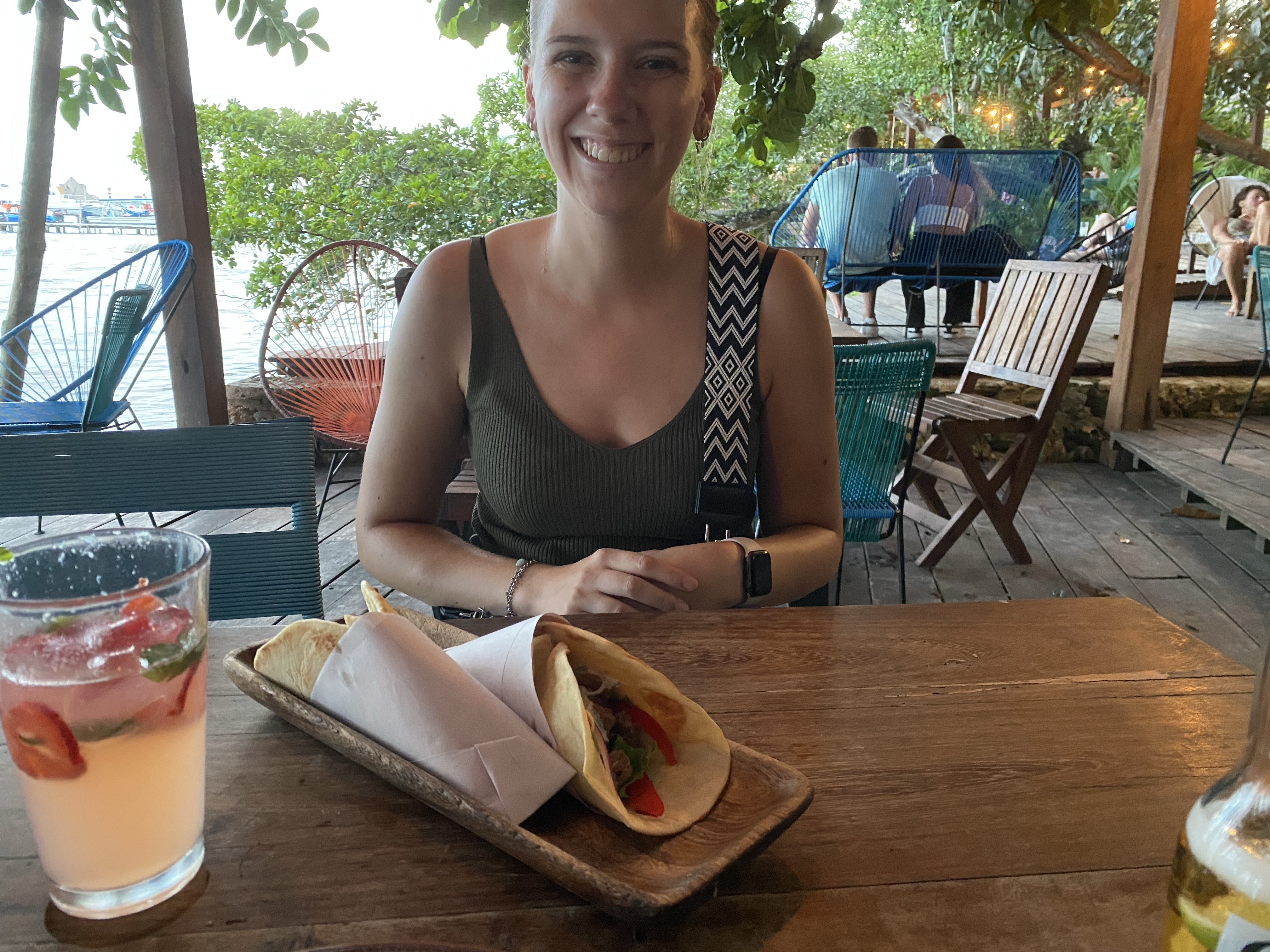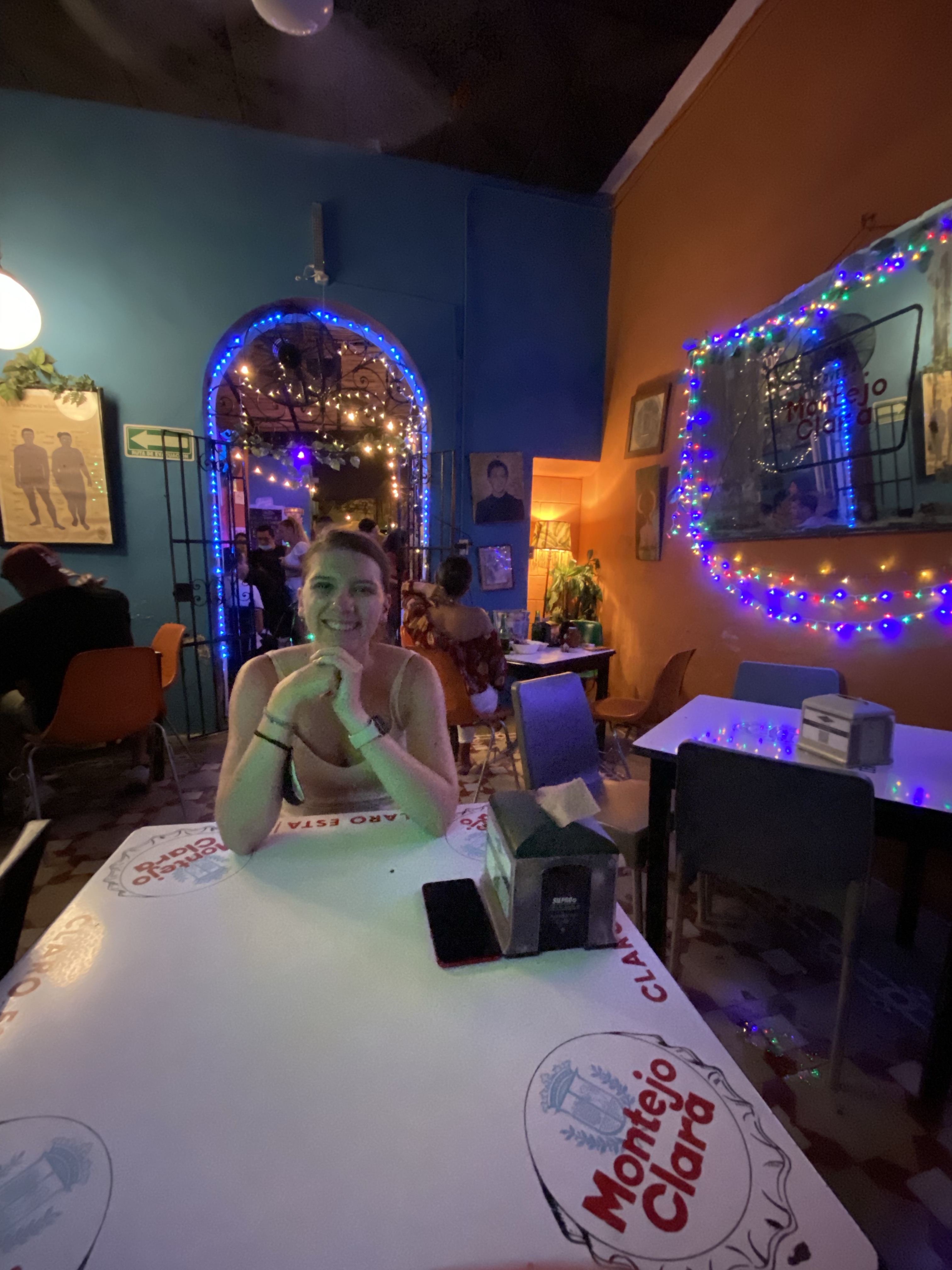 Na een lange terugreis, zijn we gaan eten in Merida. Al een paar avonden lopen we langs het cafe/restaurant/bar La Negrita. Deze plek werd op internet aangeraden als een leuke plek om wat te eten/drinken. Wanneer we langsliepen vertelden mensen die weggingen dat het een goede plek was, dus besloten we hier vanavond te gaan eten. Binnen aangekomen bleek het een stuk groter dan het van buiten lijkt. Overal waar ruimte was stond een tafeltje met stoelen. Je zat dus best dicht op elkaar. Overal om je heen zag je gekleurde lampjes. Van die lichtslangen of gekleurde kerstverlichting. Daarbij stond de muziek lekker hard. Het leek ons een leuke plek als bar om ‘s avonds iets te drinken en er een feestje van te maken. Als restaurant raden wij het niet aan. Het eten was trouwens wel prima. Robin had quesedillas en ik taco’s de cochinita pibil. Dit is iets met varkensvlees. Het smaakte in ieder geval goed en was niet duur.