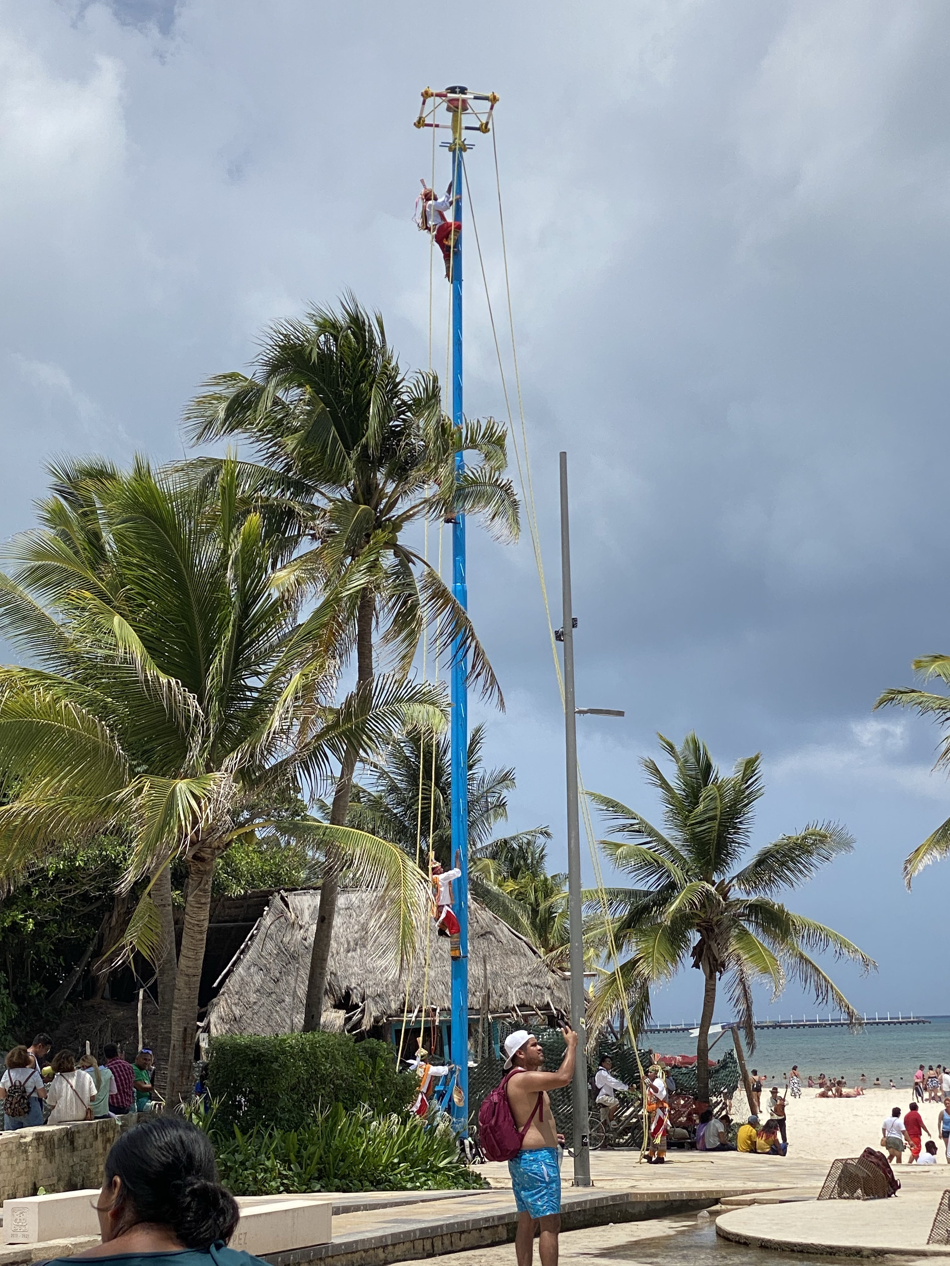 Na een bezoek aan Wallmart zijn we naar la Quinta Avenida (ook wel 5th Avenue) gelopen. Deze straat van zo’n 5 kilometer is de straat van Playa del Carmen. Hier zitten alle toeristenshops, veel restaurants, veel bars en vindt ‘s avonds het nachtleven plaats. De straat begint bij parque Funadores. Het park inlopend valt meteen je oog op een groot standbeeld van twee zeemeerminnen. Wij wilden hier rustig wat eten en kozen een plekje in de schaduw. Iets verderop op het plein was een groepje mensen muziek aan het maken, terwijl ze rond een paal liepen. Vervolgens begonnen ze stuk voor stuk de hoge paal in te klimmen. Dit zonder beveiliging of iets dergelijks. Helemaal bovenin draaiden ze rond. Als laatst klom een 5e persoon de paal in. Eenmaal bovenin lieten de andere 4 zich vallen en draaiden ze aan een touw/koord rond in de lucht. Ze zullen vast weten wat ze doen, maar waren wat ons betreft niet wijs.