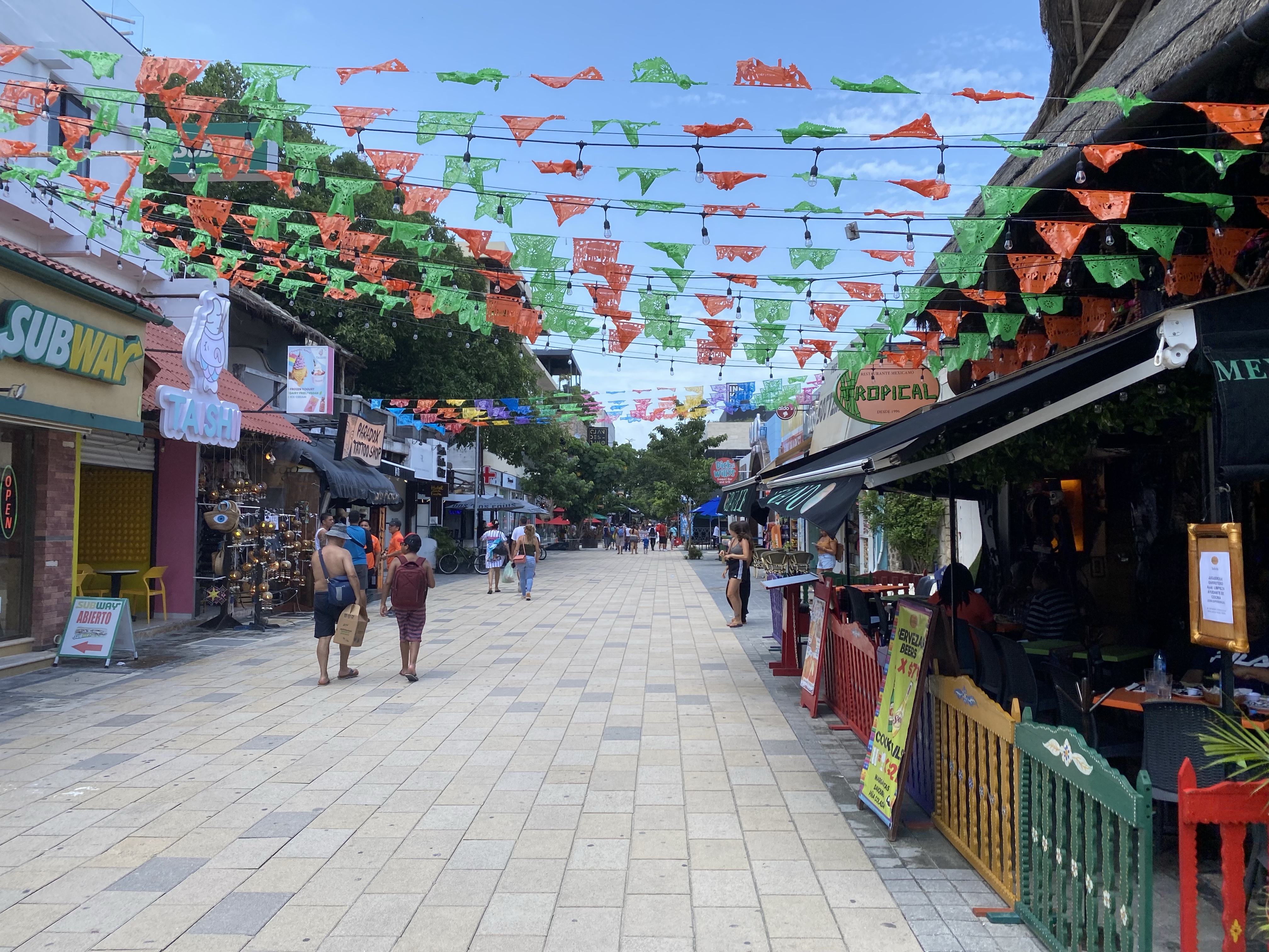 Na dit spektakel aanschouwd te hebben, hebben we een heel stuk over Quinta Avenida gelopen. Tussendoor een keer een stop gemaakt, wat gedronken en weer door. Vanuit de hele straat loop je zo het strand op. Wij kozen uiteindelijk een plekje waar een pier zit. Helaas kon je de pier niet op, maar wel het strand. Hier hebben we wat schaduw opgezocht en een tijdje gezeten. Vanuit de plek hadden we mooi uitzicht over de kust van Playa del Carmen en het prachtige heldere water. Na hier een tijdje gezeten te hebben, liepen we verder over de straat. Al met al ziet het er vooral heel gezellig uit. Er is niet perse iets te doen, behalve chillen in een van de bars. Wij kozen uiteindelijk een leuk barretje uit met een aardige serveerder. Hij heeft een tijdje met ons gepraat en gaf handige tips over de stad en Cozumel (een eilandje dichtbij).
