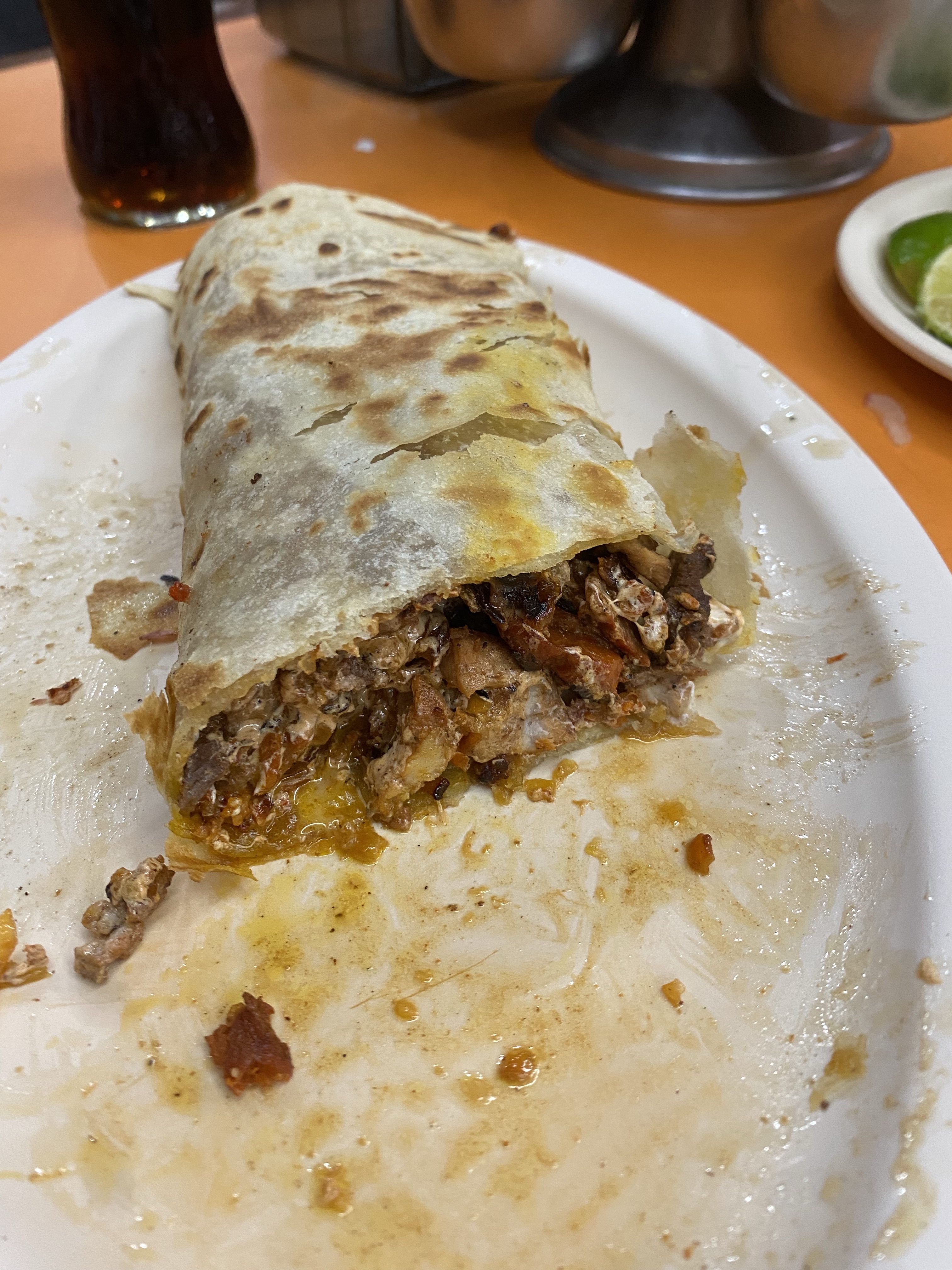 Na deze flinke wandeling hebben we ons opgefrist in ons hotel en gingen we opzoek naar El Fogon. Een restaurant wat onder de locals bekend is. Dit bleek ook wel, aangezien we in de rij moesten wachten voor we konden eten. Robin moest nog ontgroend worden en bestelde haar eerste echte tacos. Ik bestelde de taco loco (gekke taco). Ik wist niet precies wat het was, maar het bleek een wrap gevuld met veel soorten vlees. Ik weet niet eens wat er allemaal in zat, maar het smaakte goed! Robin had een soort van goede taco ervaring. Ze houdt niet zo van koriander. Laat dit nu net iets zijn wat ze op nagenoeg elk Mexicaans gerecht serveren… Met een beetje plukken kwam ze er wel.