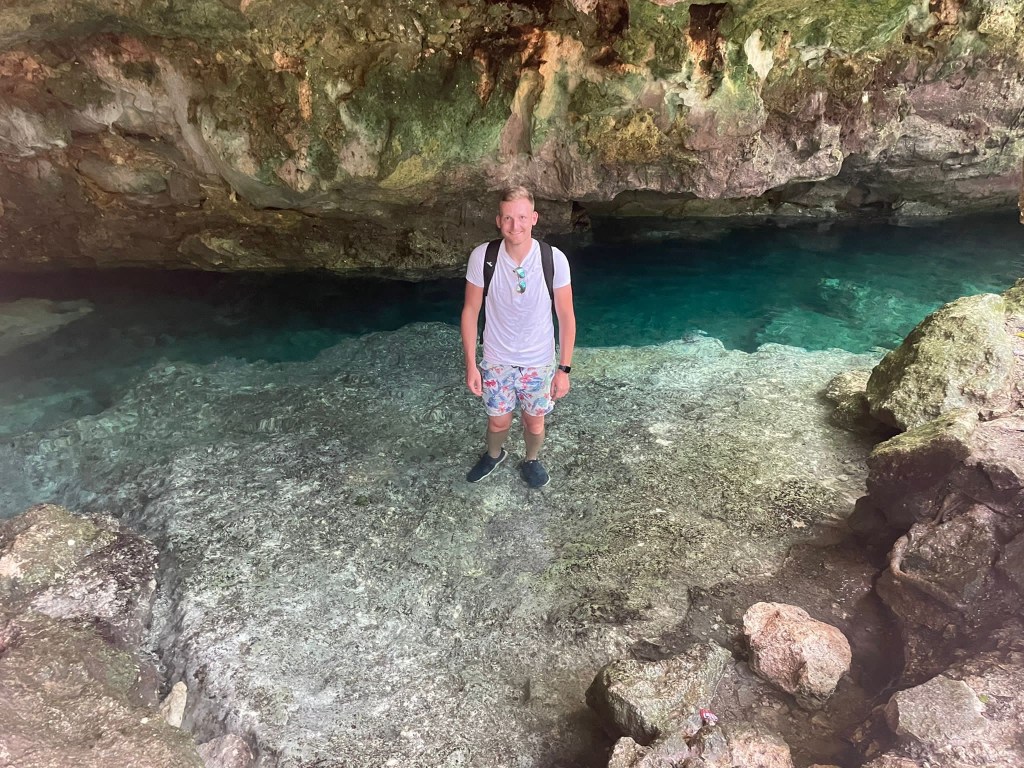 Bij de cenote aangekomen, vonden we het een beetje een rare plek. Je moest de ‘jungle’ inlopen om er te komen. Na een meter of 50 ben je al op de plek waar de cenote zit. Hij is wel anders dan de cenotes die we tot nu toe hebben gehad. Hij is een stuk kleiner en niet toeristisch gemaakt. De cenote is dan ook gratis. Toen we aankwamen vroegen we ons echter nog af of we wel goed zaten. Het leek bijna alsof de cenote droog stond. Ik dacht achterin wel wat te zien. Ik liep dus iets naar voren de rotsen op om vervolgens bijna uit te glijden. Om mijn balans te houden zette ik snel een paar passen naar voren. Het resultaat? Ik stond tot aan mijn knieën (met schoenen aan) in het water… Wat bleek nu? Het water was zo helder dat je het niet zag. Er zat ook geen rimpeling of iets dergelijks in het water. Sta je dan met je goede gedrag…