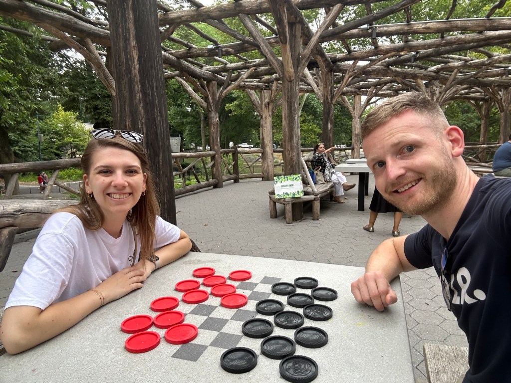 Vanuit dit hotel wandel je direct Central Park in. Onze bedoeling was om hier doorheen te fietsen, maar de huurprijzen zijn nogal fors. We besloten dus eerst maar te wandelen. Als het park de moeite waard is, kun je altijd nog fietsen huren. Zodra wij het park inwandelen, zien we meteen een herkenbaar punt. De brug uit Home Alone. Na dit opgezocht te hebben, bleek het Gapstow bridge te heten. Na een stuk wandelen hadden wij beiden zoiets dat wandelen ook wel prima is. Het leek erop dat de bredere wegen ook voornamelijk voor fietsers waren. Naar ons idee zie je dan wel weer minder van het park. Na een stukje verder lopen kwamen wij langs een schaak en dam huisje. Rondom het huisje stonden schaakborden waar je beide spellen op kan spelen. Ik weet dat dammen eigenlijk een groter bord heeft, maar het gaat om het idee. Wij besloten hier een potje te dammen. Terwijl wij aan het dammen waren, kwam er nog een random eekhoorn Robin gedag zeggen. Helemaal leuk natuurlijk.