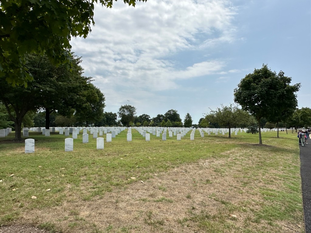 Zodra je door de beveiliging heen bent, kun je op twee manieren de begraafplaats verkennen. Met de bus of je eigen benen. Wij kozen ervoor te gaan lopen. Hoe groot kon de begraafplaats zijn? Precieze afstanden heb ik niet, maar het was groter dan verwacht. We wilden in een rechte lijn lopen. We werden echter tegengehouden door een verkeersregelaar die ons vertelde dat we niet rechtdoor mochten. Na verteld te hebben wat we wilden zien, konden we wel naar links en dan later naar rechts. Prima, doen we dat. Je loopt via deze route langs de vele graven van militairen. Als je de grafstenen leest, zie je ook welke oorlogen ze gevochten hebben. Hier zie je voornamelijk WWI, WWII, Korean, Vietnam staan.
