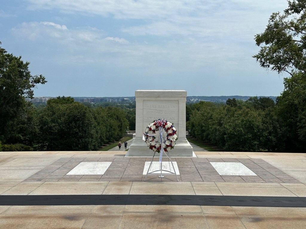 Na een minuut of 10-15 lopen, kwamen we uit bij het eerste bijzondere graf. Dit is het graf van The Unknown Soldier (de onbekende soldaat). Dit graf is ergens een symbolisch graf, omdat niet letterlijk alle niet geïdentificeerde soldaten hier begraven liggen. Na de eerste wereldoorlog is er één ‘onbekende’ soldaat uit vele gekozen die hier begraven is. Deze soldaat vertegenwoordig alle onbekenden. Na de tweede wereldoorlog en Koreaanse oorlog zijn hier 3 soldaten aan toegevoegd. Eén soldaat voor de Europese oorlog, één voor de Pacifische en dus één voor de Koreaanse. Met de informatie die we lazen is dit wel een indrukwekkende plek om te zien. Bij het graf loopt ook 24 uur per dag, 365 dagen per jaar iemand van ‘the old guard’. Wij hebben ook de wisseling van de wacht nog gezien. Dit is allemaal vooral erg ceremonieel.