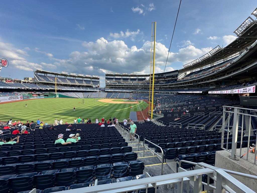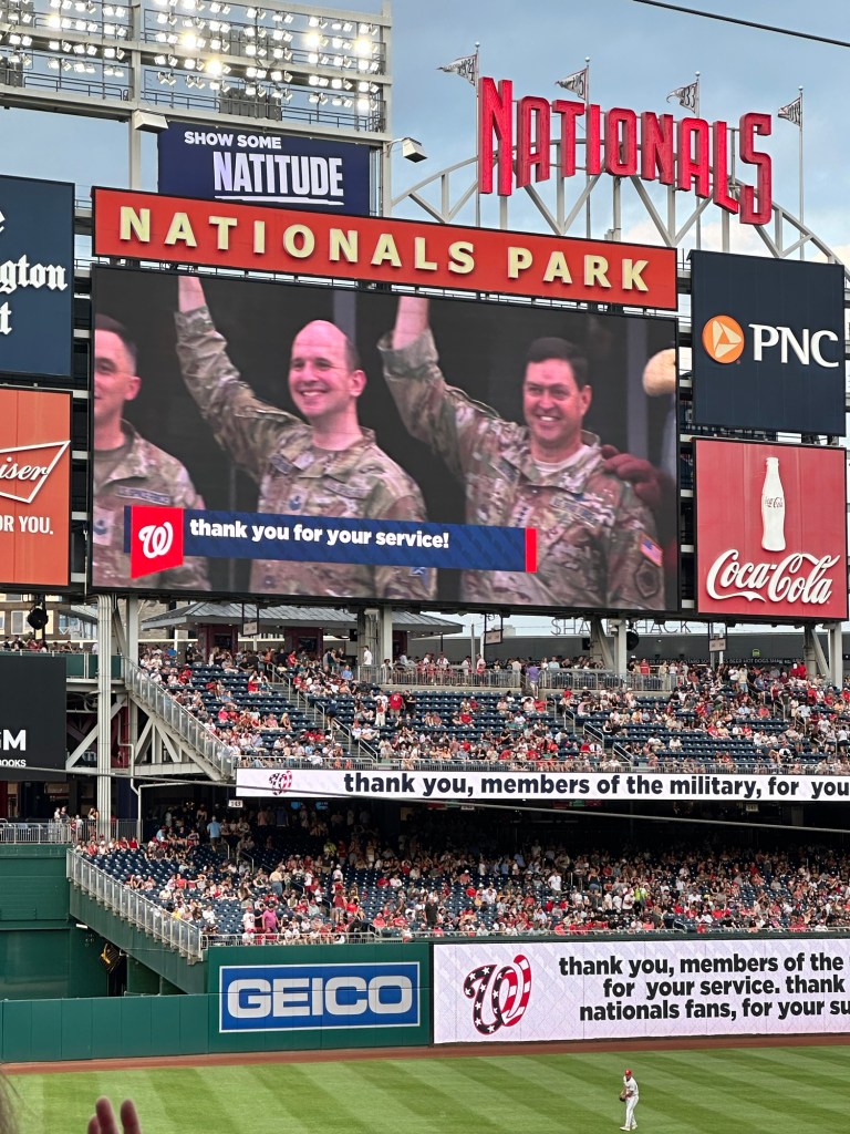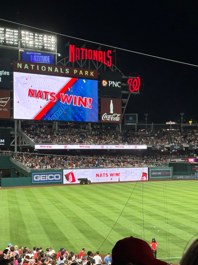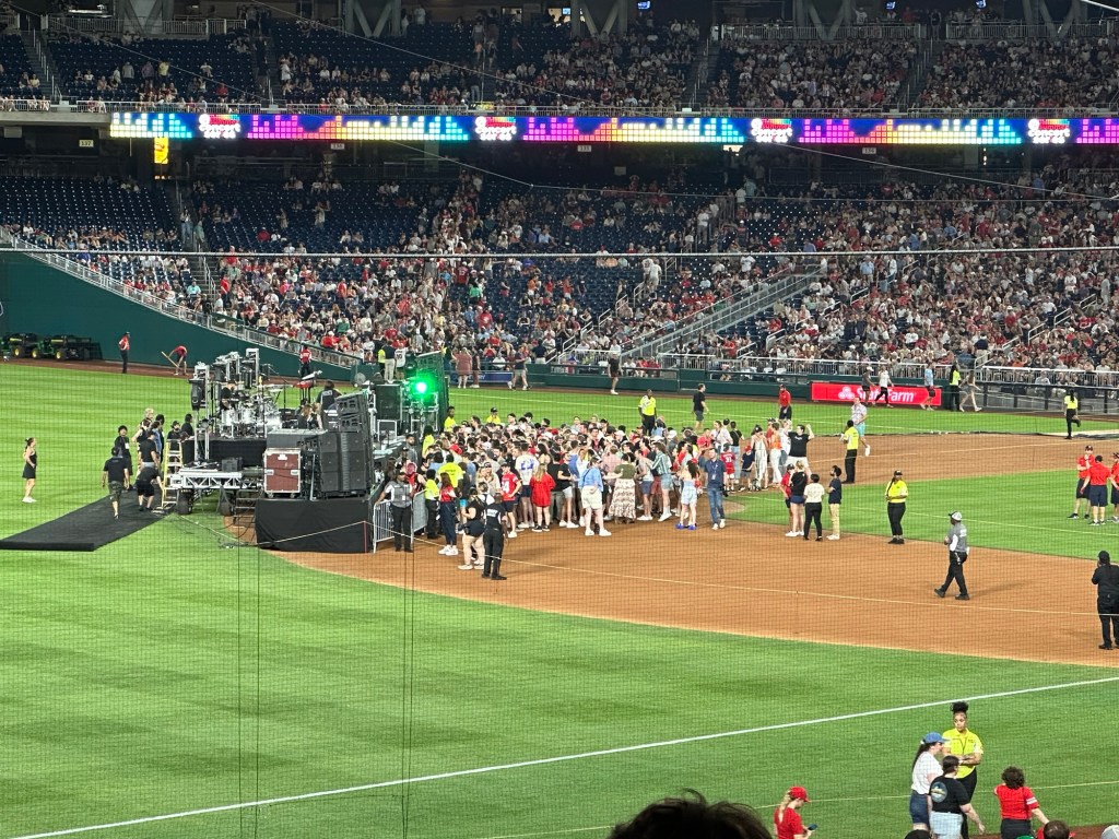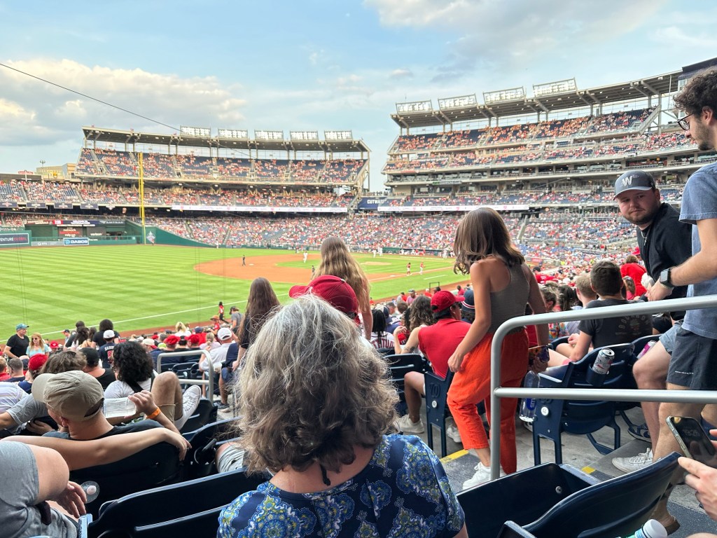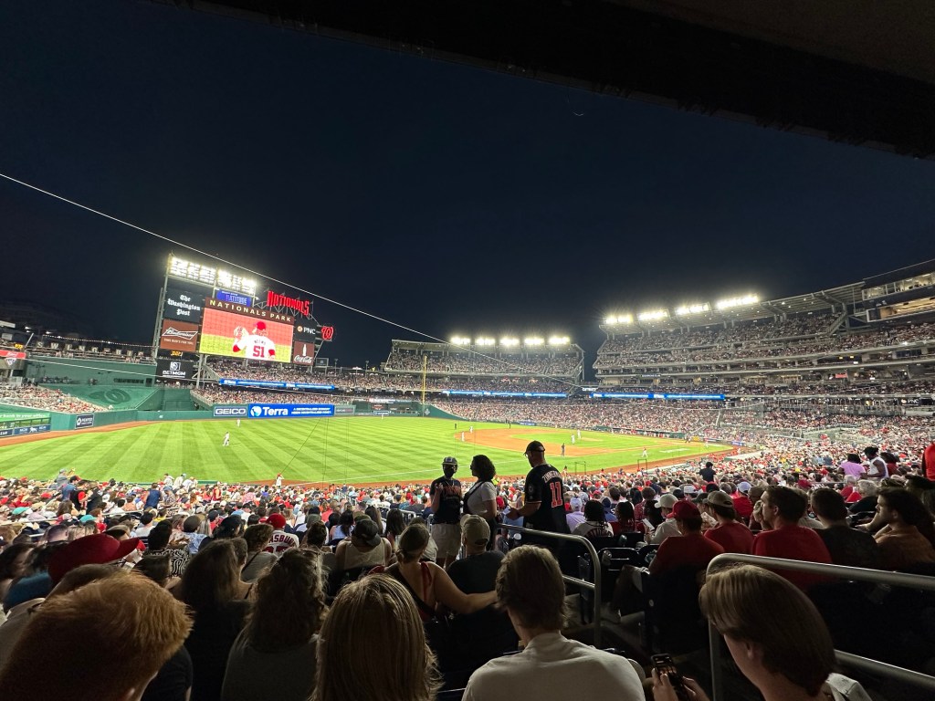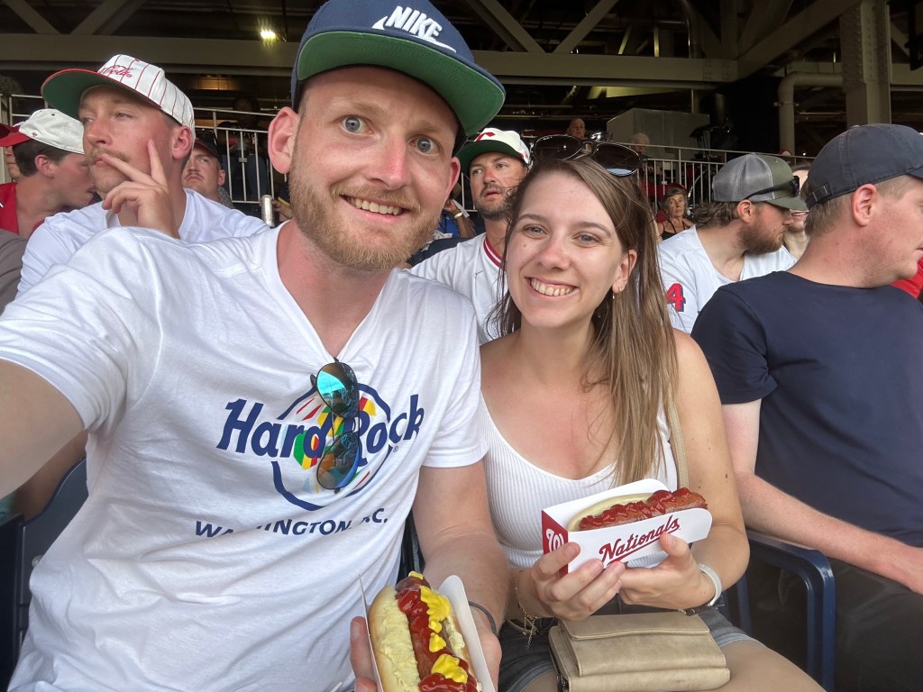 Over het algemeen was er wel een fantastische sfeer. Alles aan de wedstrijd was zo Amerikaans als je je het kunt indenken. Veel te dure snacks; welgeteld $42 voor één flesje frisdrank, blik bier en twee hot dogs. Maar de ervaring is zo wel compleet! Tussen de innings door werden er spellen gespeeld met mensen uit het publiek. Tussen de slagen door worden geluiden afgespeeld, zodat het publiek mee juicht of klapt om sfeer te krijgen. Er werd een ren wedstrijd gehouden tussen mascottes met de hoofden van presidenten. Eigenlijk is het allemaal een grote poppenkast, maar het geeft een erg leuke ervaring. Na de wedstrijd kregen we nog een concert van Carly Rae Jepsen. Wellicht ken je haar van call me maybe of good time; hier kenden wij haar in ieder geval van. Helaas hebben we deze twee nummers niet gehoord. We waren rond 17.45 in het stadion en waren er rond 22.45 wel klaar mee. Naar buiten lopende viel het ons overigens op dat er niet veel politie aanwezig was. Slechts een paar auto’s hier en daar. Dit was dan ook niet nodig, want er was een gezellige sfeer overal. Kijk hier het TikTok filmpje.