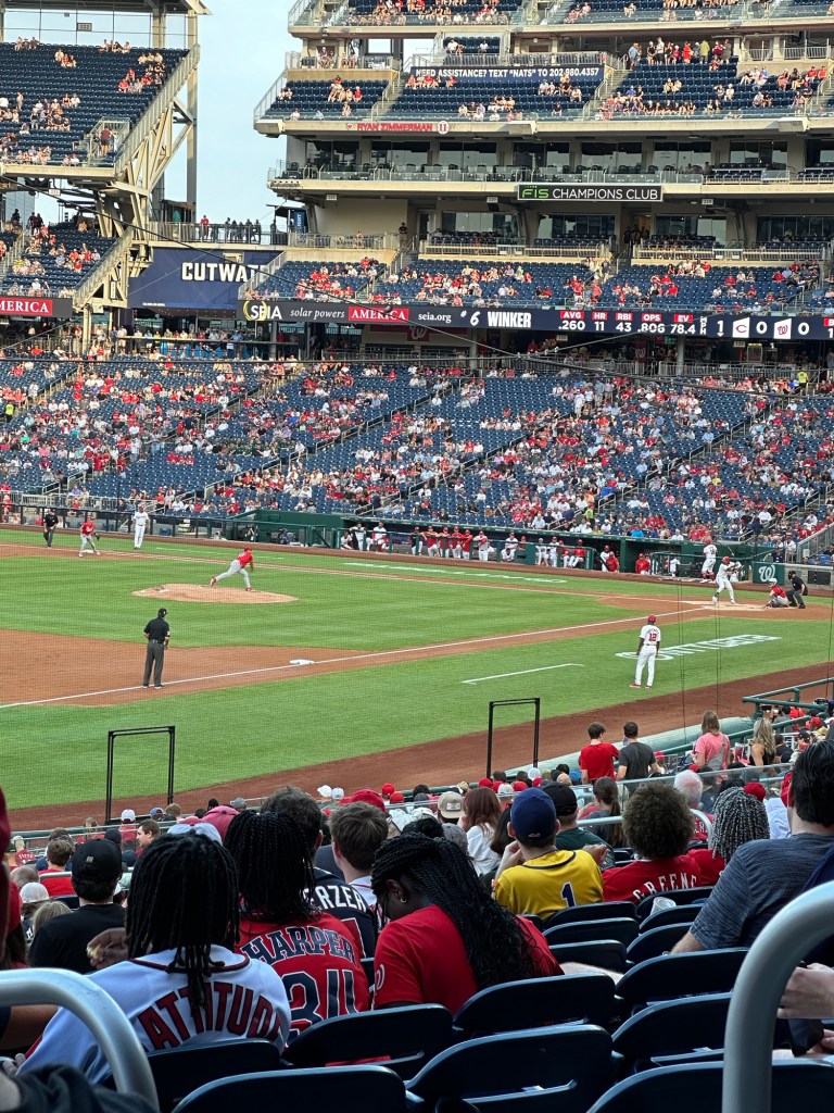 Dat het een langzaam spel is klopt zeker. Wij waren ruim voor de start van de wedstrijd aanwezig. Om 18.45 begon de wedstrijd (eerste inning van in totaal negen), maar het stadion was amper half vol. Terwijl de innings verder kwamen, raakte het stadion steeds voller. In de wedstrijd zelf gebeurde lang niet veel. In de eerste twee innings raakten beide teams geen knikker en werden er geen punten gescoord. Het eerste punt kwam van de Reds in de derde inning. Daarna begon het iets te leven scoorde de Nationals 7 punten in twee innings. Tot aan de negende was het een lange zit en werd het aan het eind ineens spannend toen de Reds weer punten begonnen te scoren. Uiteindelijk wonnen the Nationals en was het groot feest in het stadion.