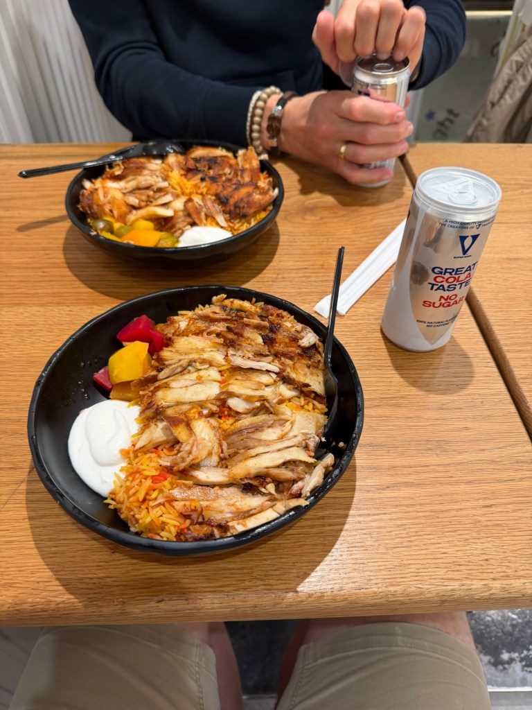 Ragab begon al snel hele verhalen te vertellen in moeilijk verstaanbaar Engels over wat we moeten doen. Hij beantwoordde alle vragen die ik had en gaf veel tips mee. Echt een top chauffeur! Eenmaal afgezet gaf hij mij zijn nummer. Ik mocht hem altijd contacten als ik een chauffeur nodig had of voor vragen. Snel vonden we ons hostel. Tenminste, er hing een bordje met de naam van het hostel. Er kwamen al reacties als: Is het nog in aanbouw en is hier een raket op gekomen? Maar hoewel de entree er nogal sketchy uitziet, is het hostel van binnen netjes met een ruime kamer. We hebben onze spullen gedumpt en zijn snel wat gaan eten. Het was inmiddels al rond 19.30 en we kregen trek. We gingen naar een restaurant dat werd aangeraden door de hosteleigenaar. Hier bestelden we fattah. Dit is rijst met kip shoarma, stukjes krokant brood en een sterke knoflooksaus. Dit samen met 2 blikjes cola kostte slechts 469 Egyptische pond (omgerekend € 7,68).